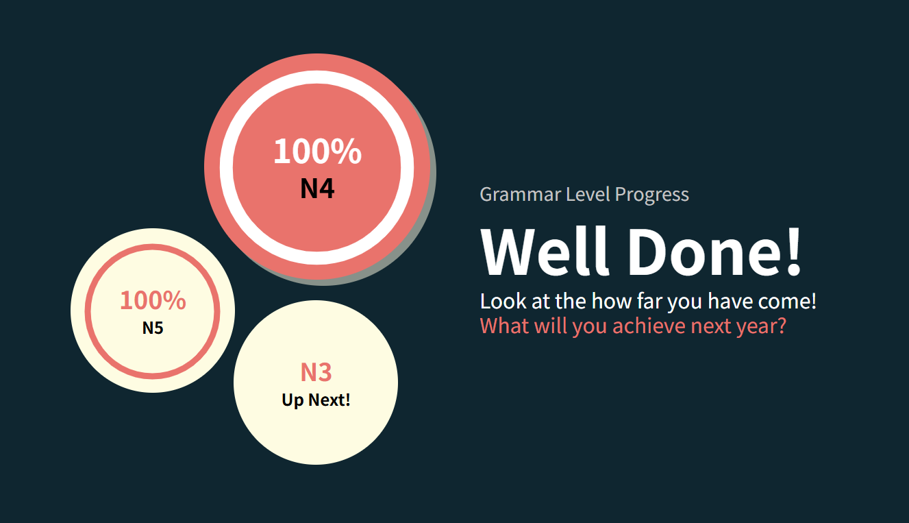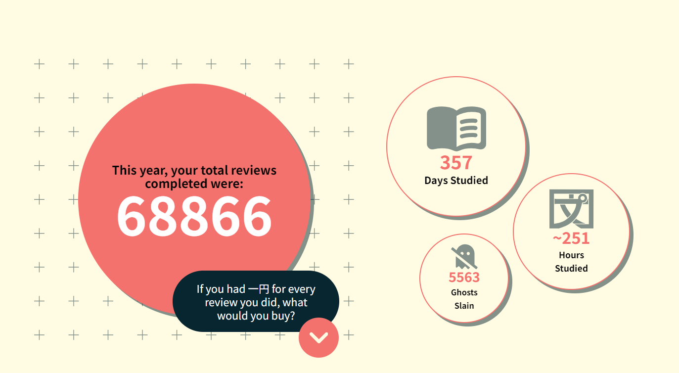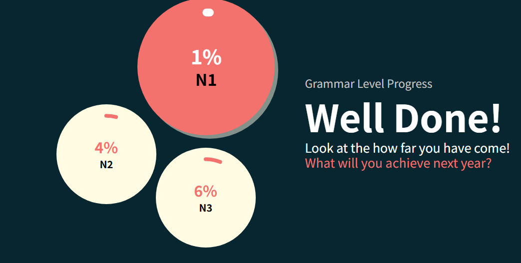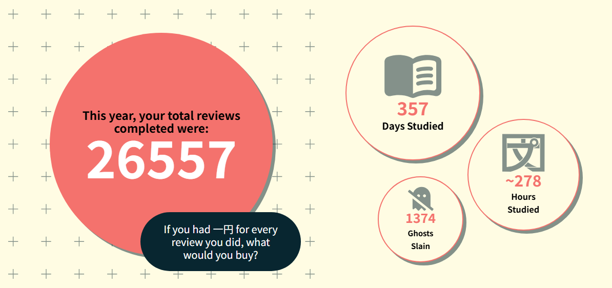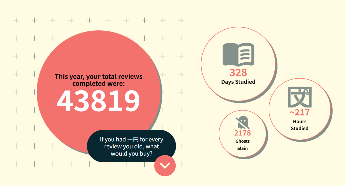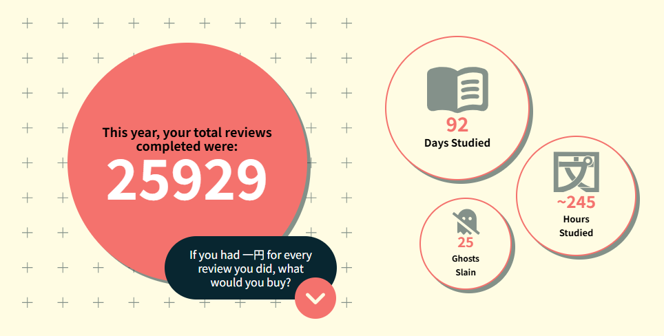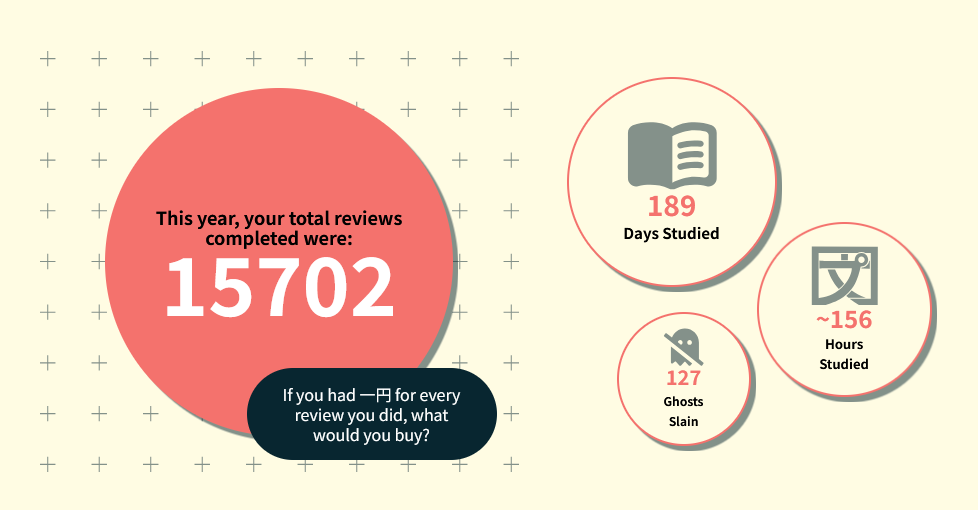 Bunpro has always existed not just to help you learn Japanese, but to help you build confidence in you understanding and to encourage you to start immersing in native-content as soon as possible. It’s our hope that something you struggled to read or listen to last January is now something you feel much more comfortable with going into the new year.