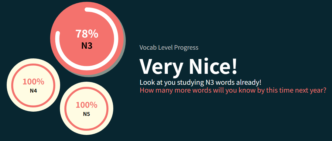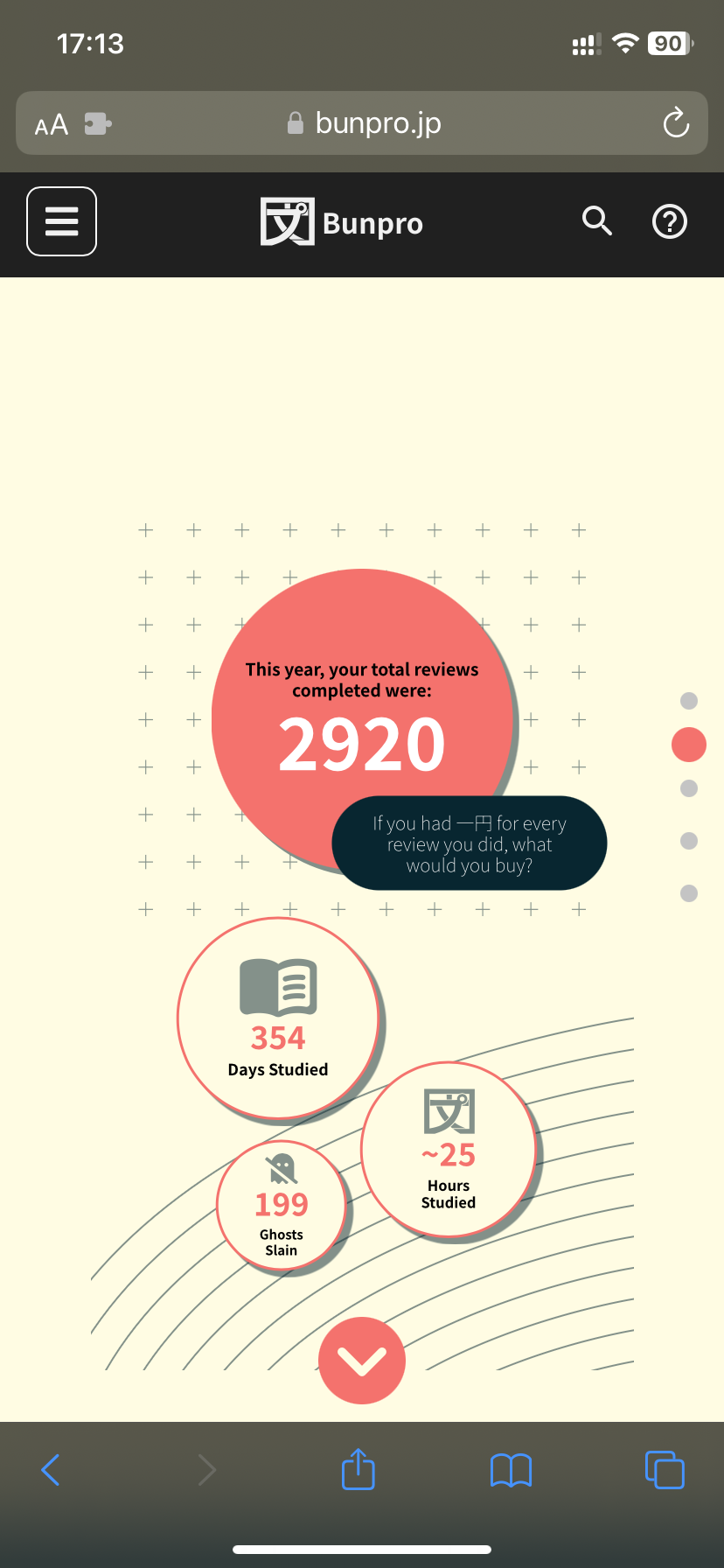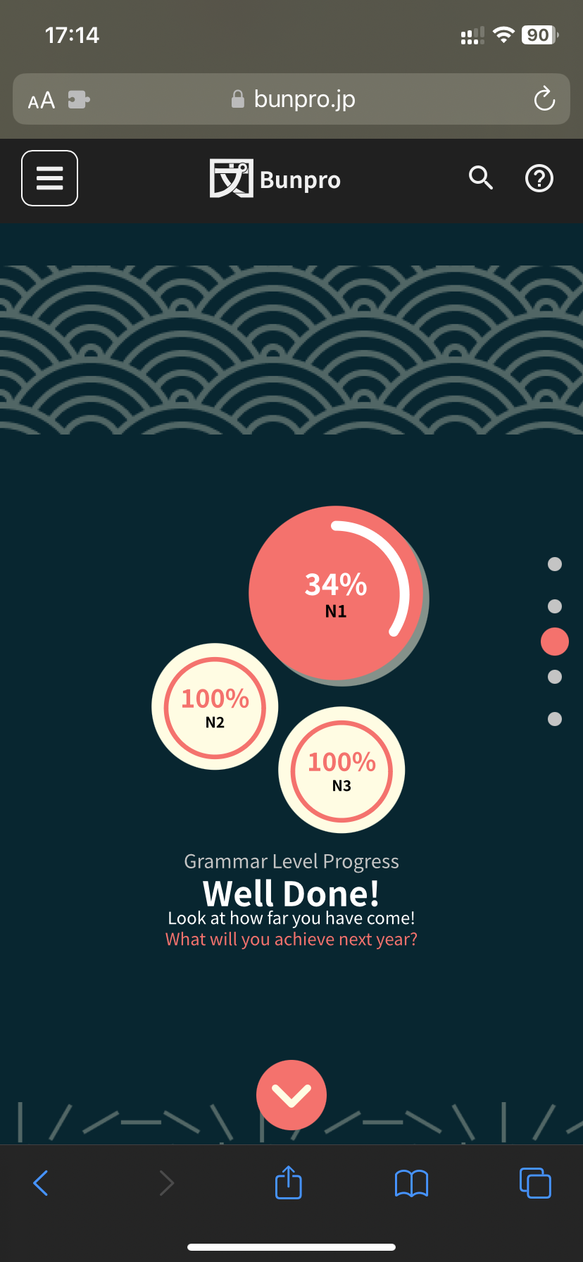 Originally, I only used BunPro for grammar and thought WaniKani + real life would cover vocab. I found this to have been my biggest mistake. I started dating a Japanese girl who speaks zero English in the Summer, and in the early days we were completely unable to have meaningful conversation without the use of AI translations. And that’s what led me to use BunPro vocab, to expand my vocabulary. And now I’m able to sit back and have political discussions with my GF’s family, navigate 不動産屋 conversations fully in Japanese. I still have to whip out the 辞書 often for words I don’t understand, but I feel like I actually speak Japanese now. And BunPro is a massive part of that. Here’s to another year of progress!