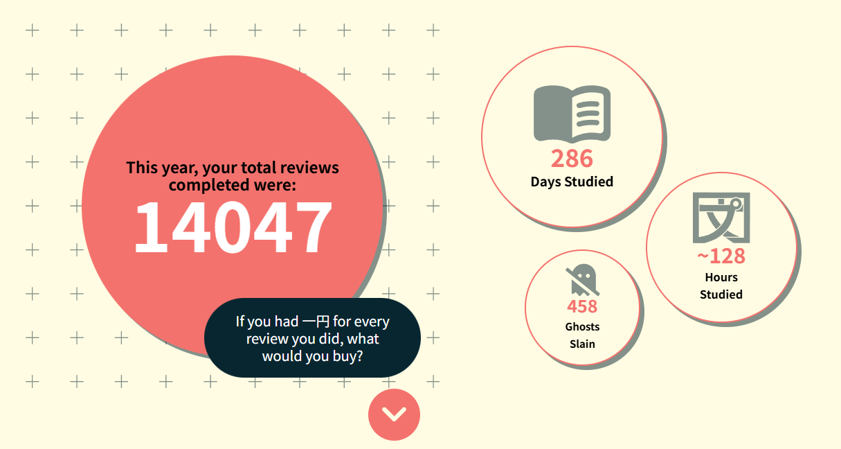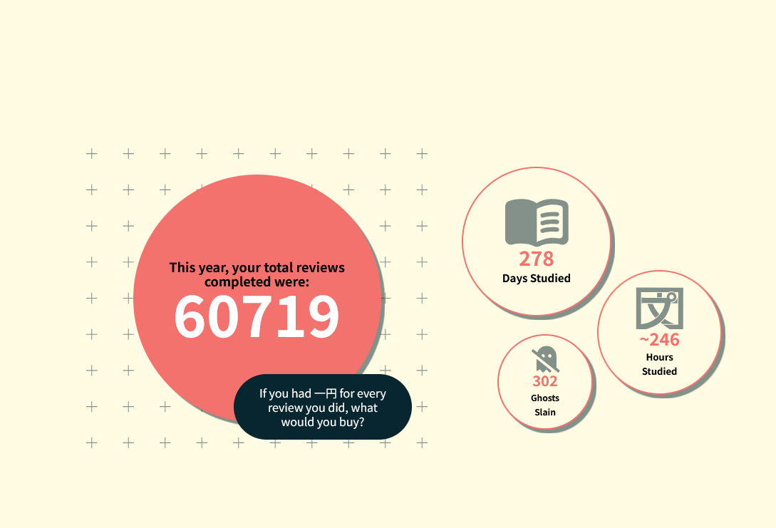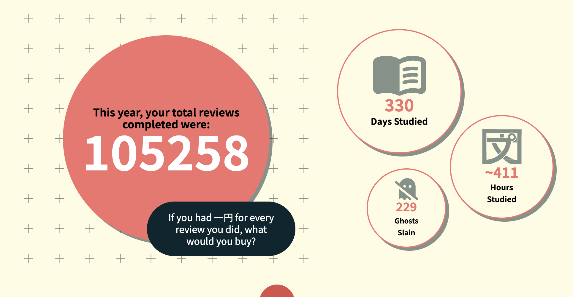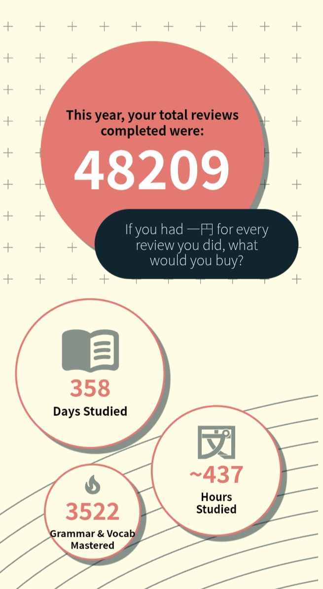 Wow, so much fun to see this! Some days I feel like I still don’t understand the most basic of concepts in Japanese, but looking at this recap I realise how far I have actually come this year.