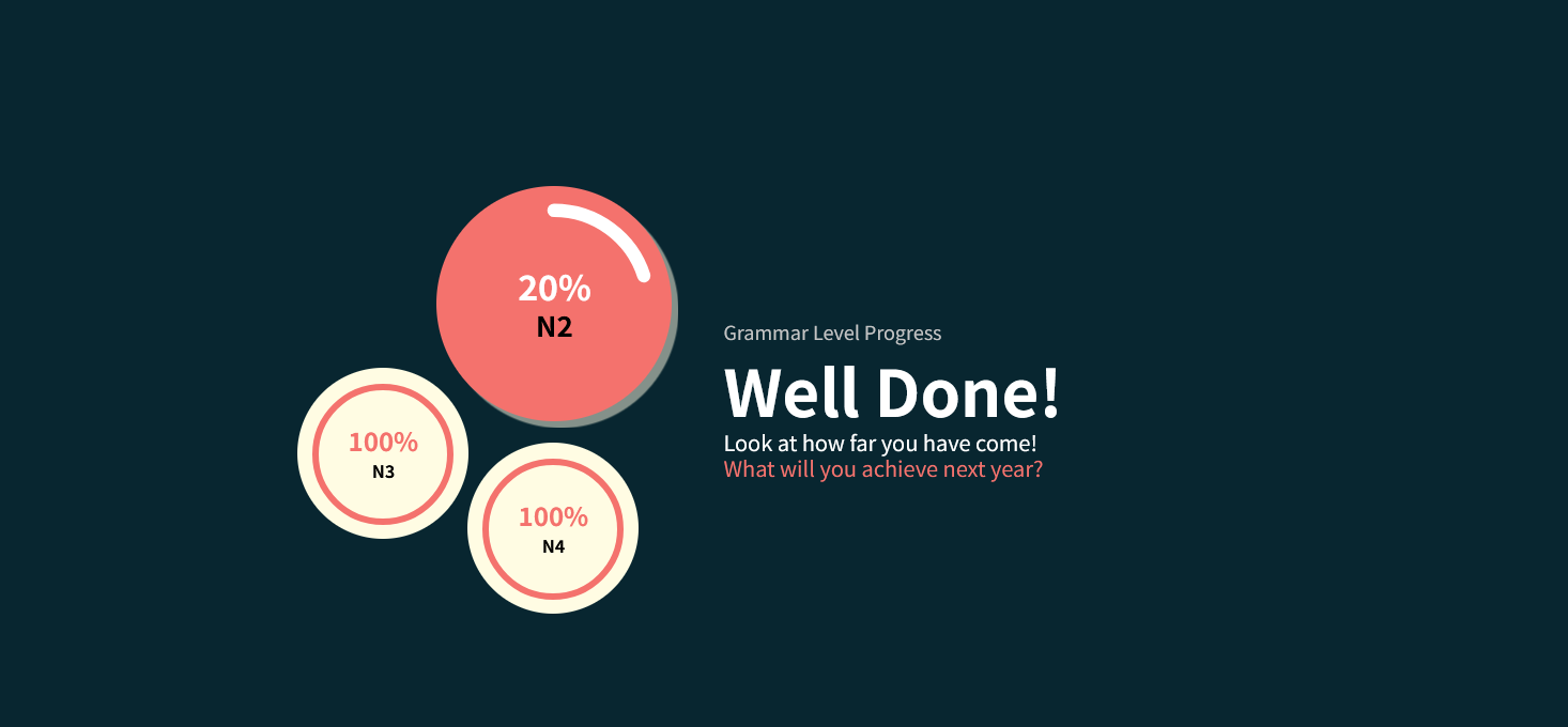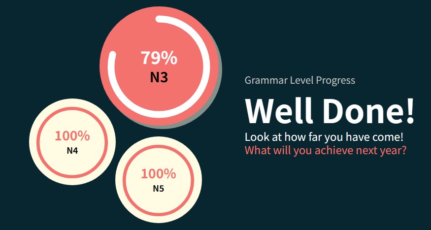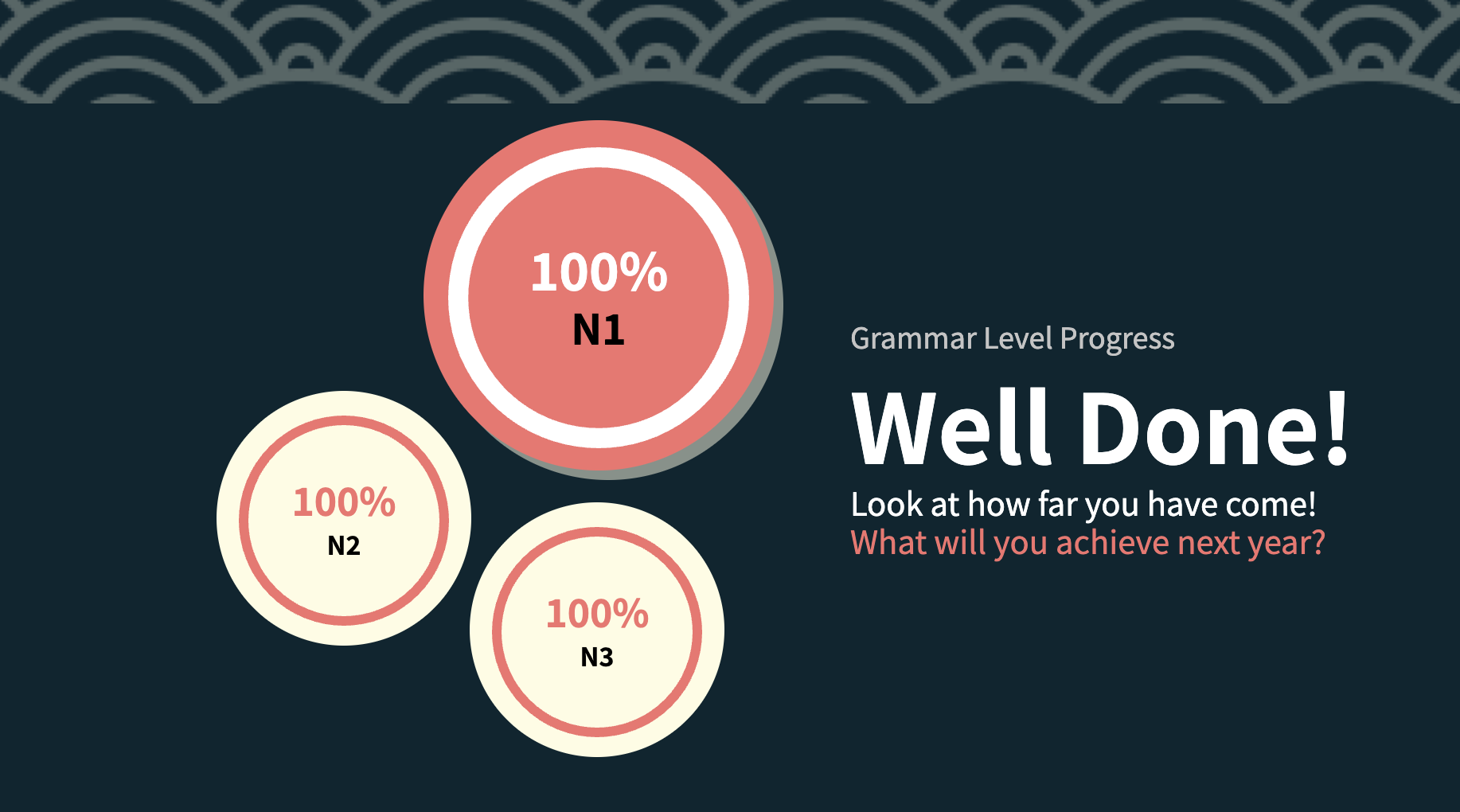 Whoa, TIL I’m 87% done with N5 grammar - that’s pretty wild to think about. Hoping I’ll actually start flexing my skills by reading some actual books in 2026! Happy holidays y’all <3