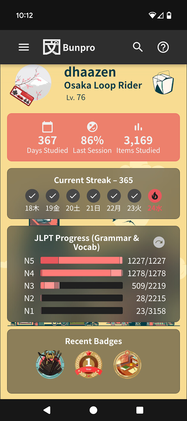 I think that’s the main stuff. Thanks to the Bunpro team for making an awesome app! If it wasn’t for this I don’t think I’d be remotely as far along as I am now. I always feel like I have so far to go but it’s nice to look back and see how far I’ve already come so far.