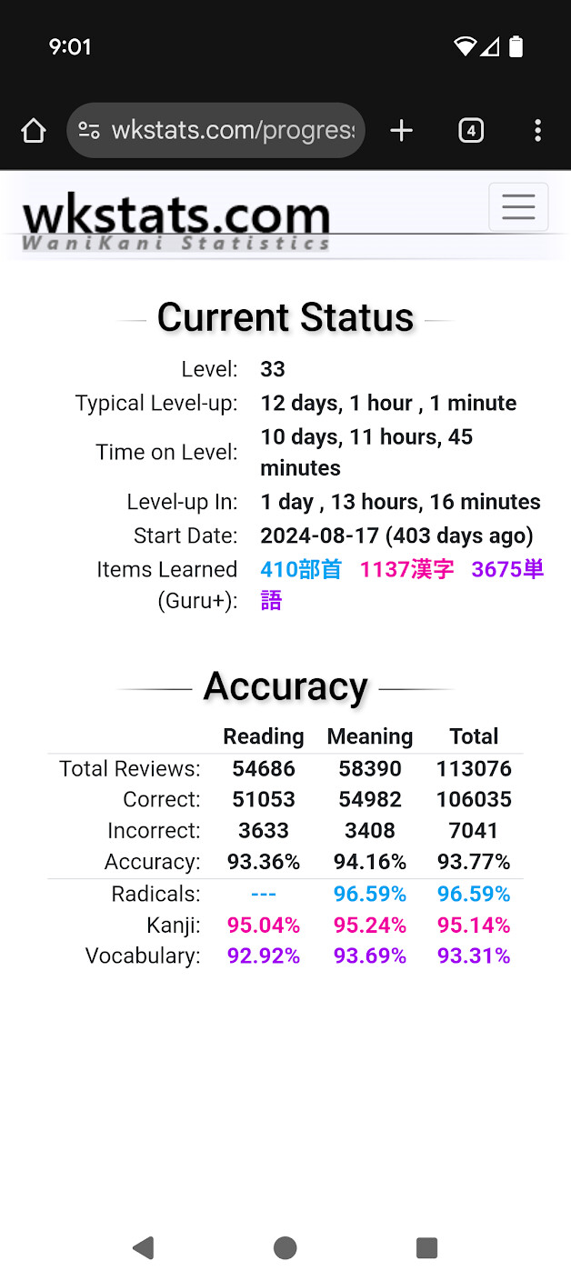 I have heard others say it but I really think learning Kanji early on has been super helpful (although annoying since it takes so much time). But while I read I’m continuously practicing my kanji and it also helps a great deal with vocab memorization/understanding because the meanings kind of help out with hints and patterns for words. Also for Wanikani I use the Smouldering Durtles App so I can customize things. I grade myself without filling in the blank to save time on typing and save myself from typo errors. For custom Bunpro settings I turn the Ghosts setting to “On” as opposed to Minimal. I really find if there’s something I’m having trouble with I need to see it a lot so I really enjoy that. Also set my SRS Strictness to 3 stages for similar reasons. I found if it just goes down a bit when I mess up I just wasn’t seeing things often enough.