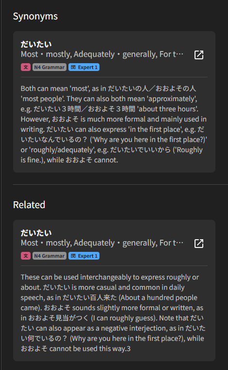 Actually, now that I’m looking at the bottom of the page, it seems like “だいたい” is marked as both a “Synonym” and “Related?”