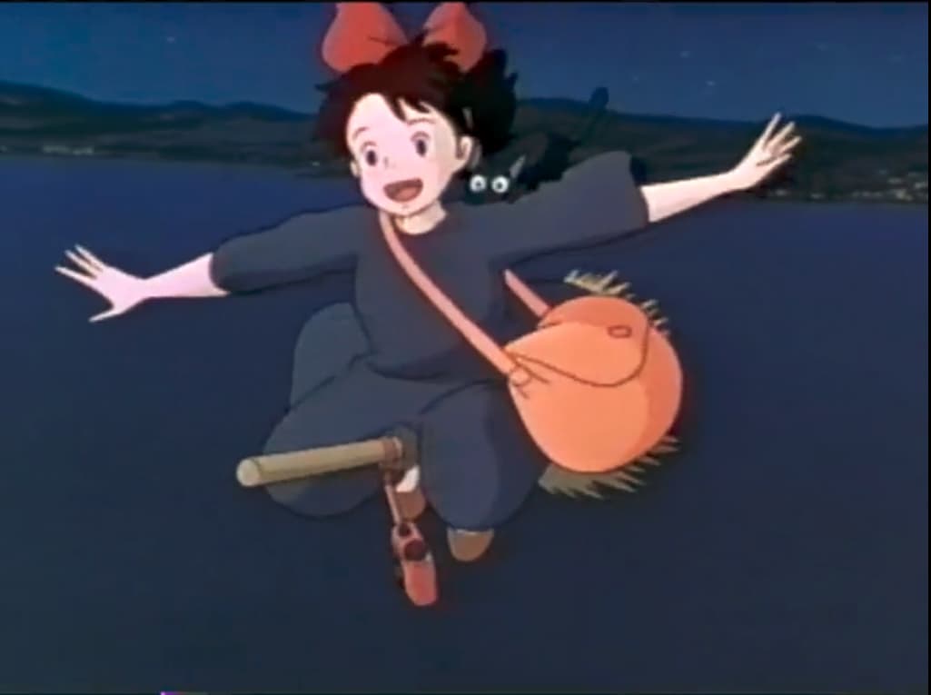 Here’s a picture from the intro scene of Ghibli’s version of Kiki’s Delivery Service, which shows Kiki flying on her coming-of-age day: