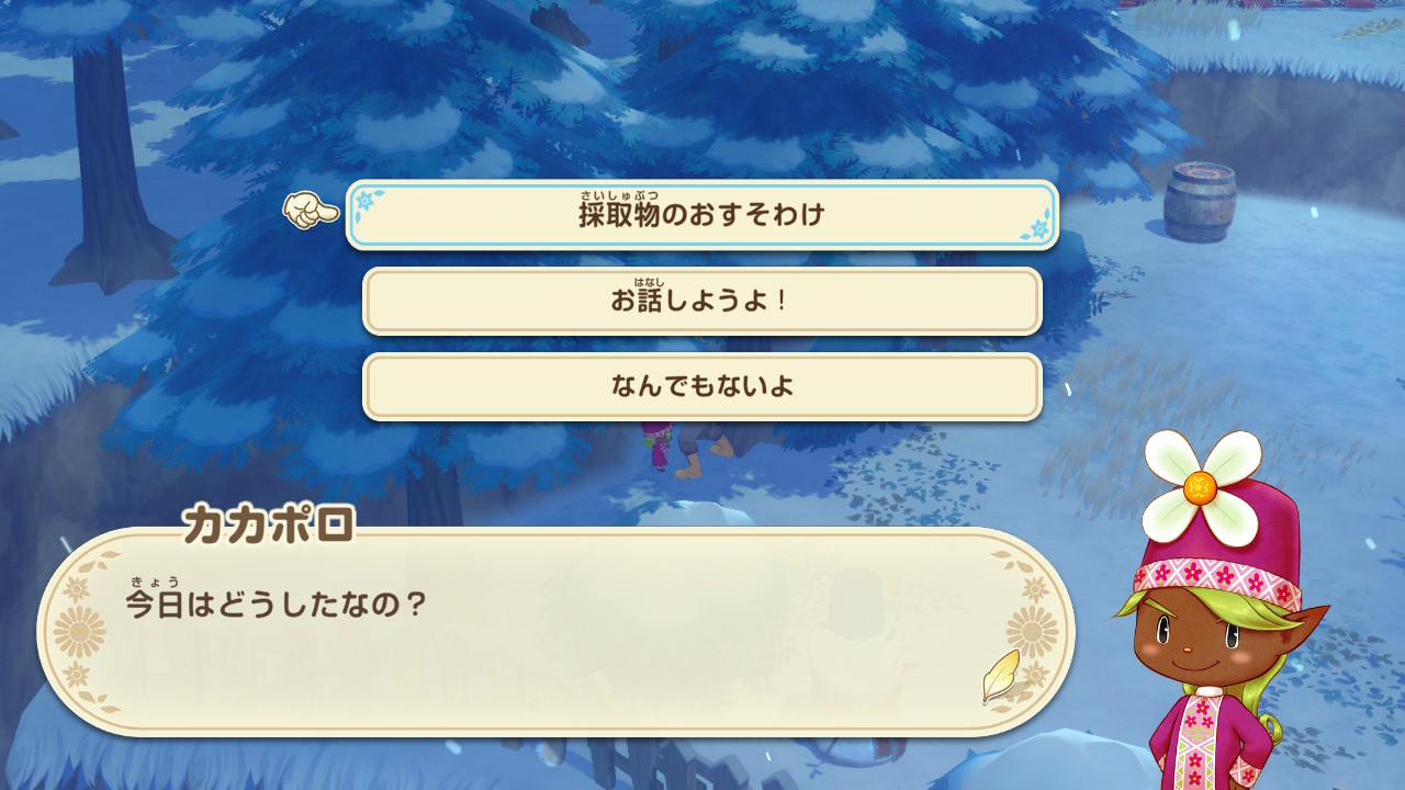 I’m currently playing 牧場物語 Let’s 風のグランドバザール and there is a mechanic in it where you can give things to characters in exchange for upgrades (screenshot above).
