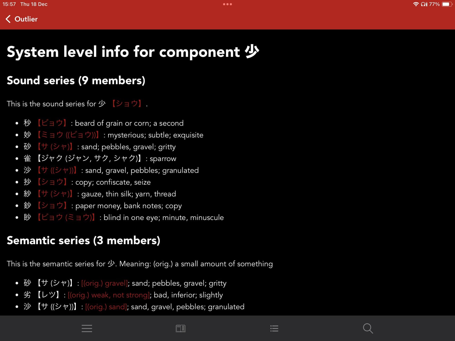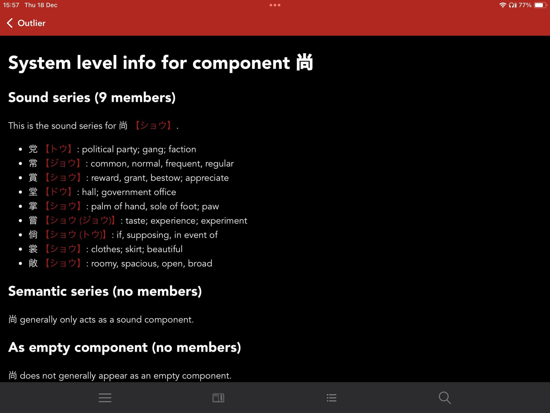 In this case it is 状況 which I know well enough. So when I think about 状況, 状態, 情報(状態報告) comes to my mind, going thou other words with it I notice that I konw 白状 so it’s now assigned to this kanji as well giving me additional connection. This time I didn’t look up etymology dictionary for some reason, but the thing why I decided to write this message, I was trying some new learning approaches with easy content and came accros 将来 which I know, but not like I know difference between it and 未来 and not that I can read it. Anyhow, it’s read しょうらい and I see that the left part 将 of it is same as the left part of 状, and now I’m almost sure I’ve found a new sound component, because しょう (将) and じょう (状 ), just the same thing.