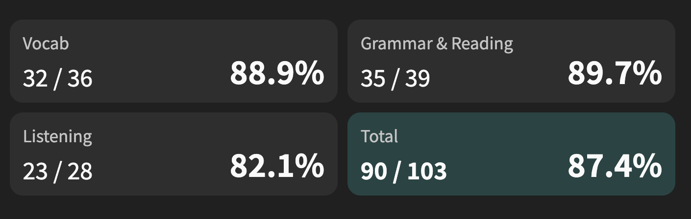 75% on mock bunpro’s N1 test 1 (I was rusty). Real test between 80 and 95.