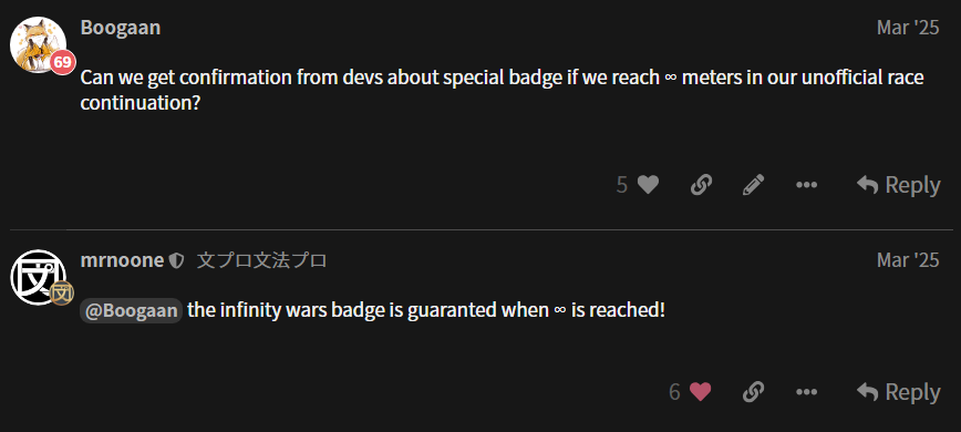 - What about a badge? = It’s confirmed that we will get the badge when we reach ∞!