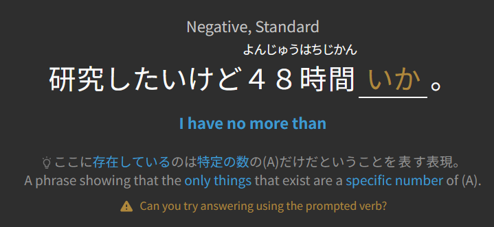In this case though, the prompted verb is usually in parentheses after the sentence, so it’s pretty confusing if it’s only hinted in the translation of the sentence