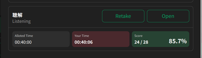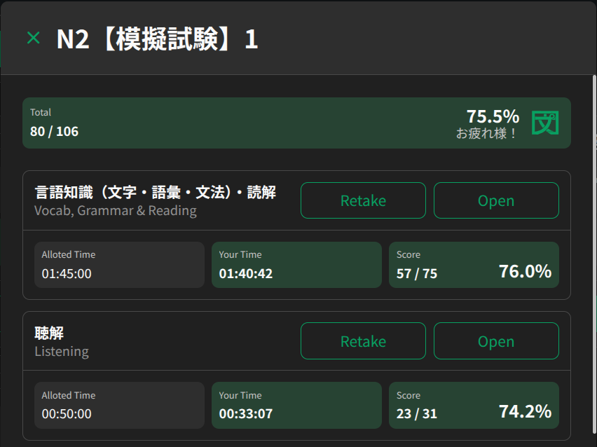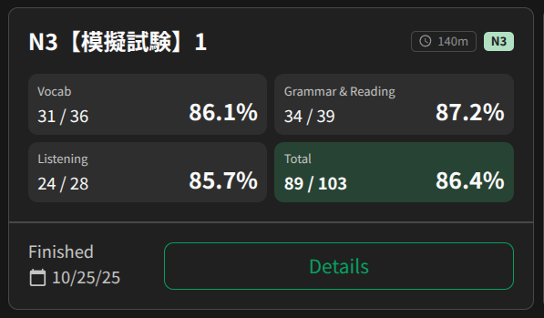 About a month after the Bunpro mock tests were released, I took the N3 test and got 86% on it (15th month of study, but after a break of 3 months).