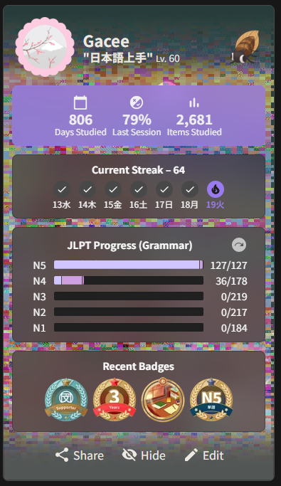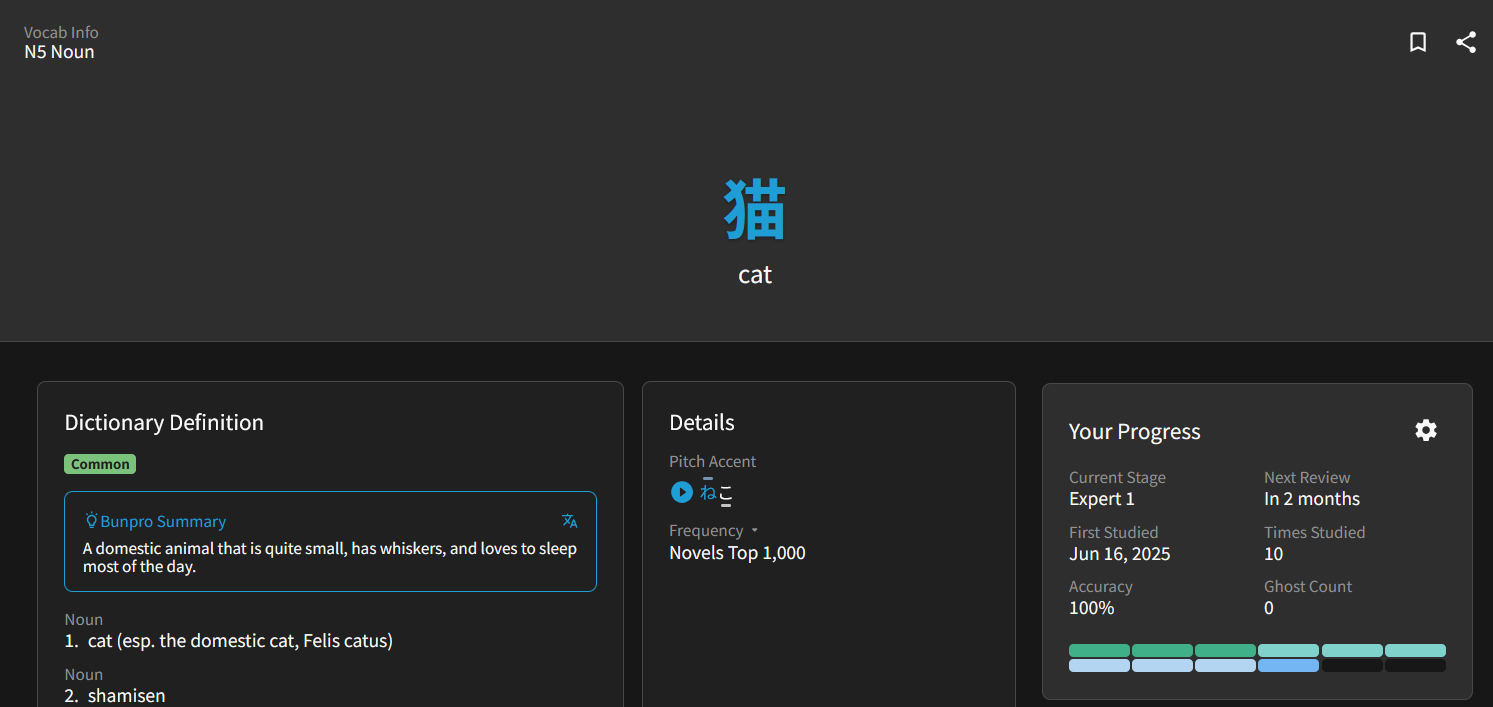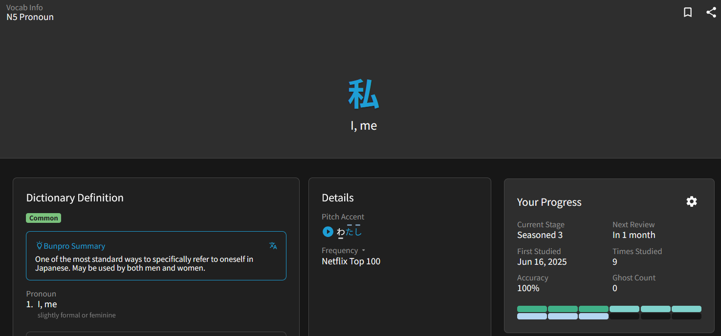 Furthermore, none of the other items in that lesson have managed to advance to Expert in the following week, here you can see ç§ from the same date, currently in Seasoned 3 with the same starting date and accuracy, which will only repeat in a month. Interestingly, you can see that it has been studied one time less than ç«.