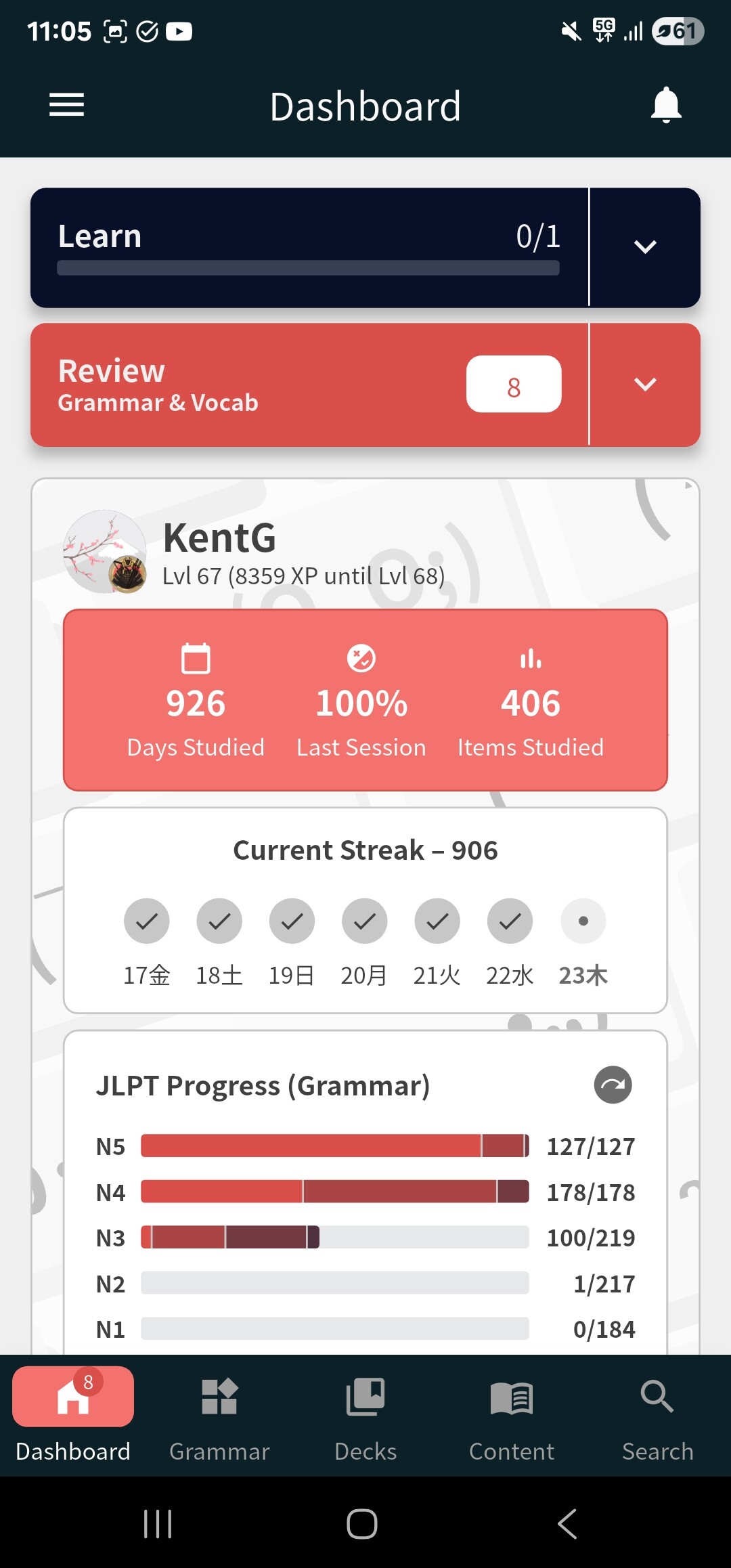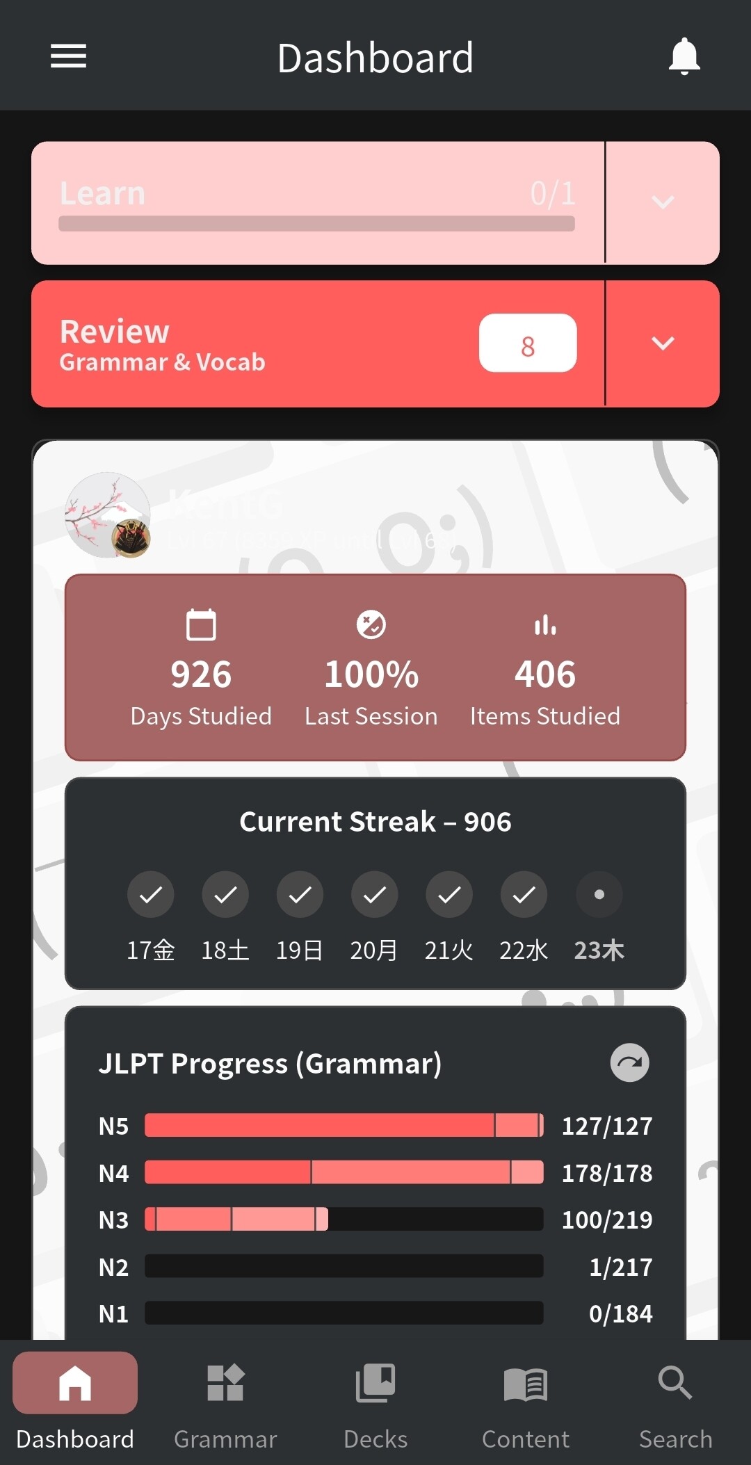 It’s not really a bug but 忘年会 bounenkai seems to have two different entries in Bunpro, one with example sentences included in the N4 deck and another without that has E1 as a tag.