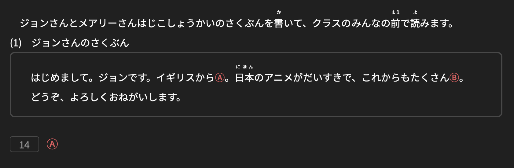 Hey! I just noticed that in the grammar & reading part of the first N5 practice test (i haven’t checked the rest), in the もんだい2 where you get an incomplete sentence with a star, you’re supposed to choose the word that would fit in the location of the star from the options given, but the exact location isn’t given in the question.