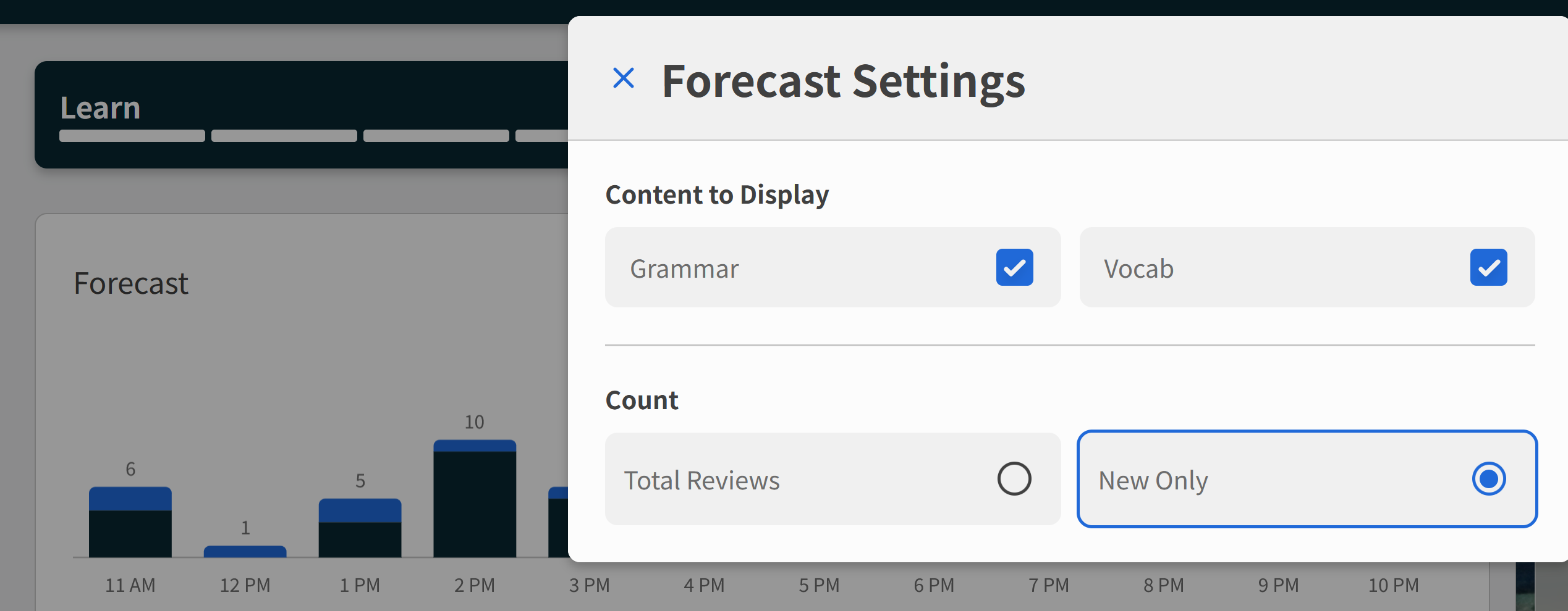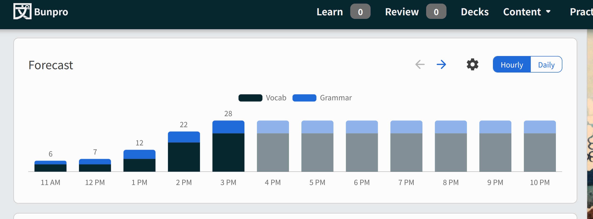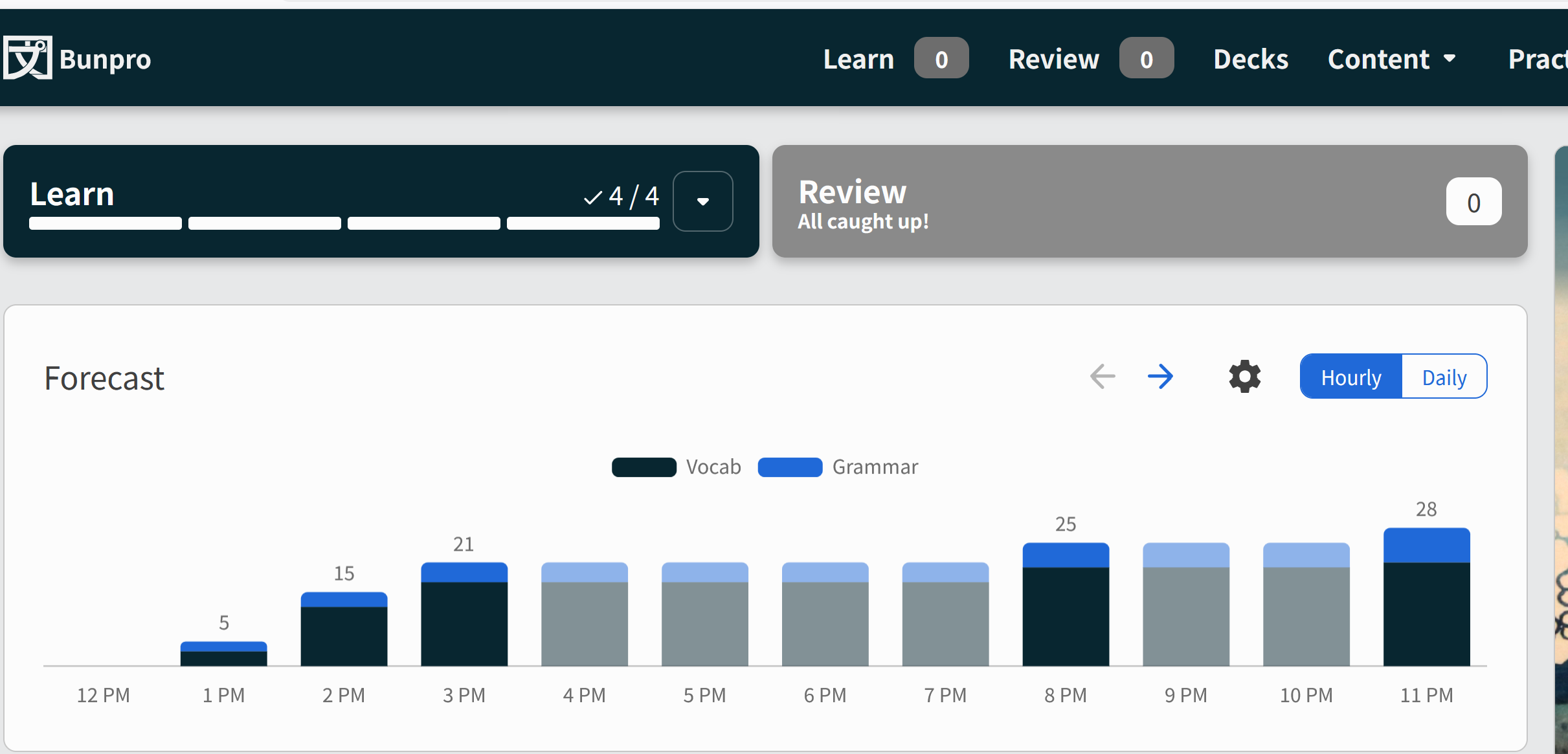 In the morning (5-6am CEST) i learned all the planned new items (my default amount 2 grammar items, 8 vocabulary items). After finishing the learning status was 9/10, showing that I still have one more vocabulary item to learn. Additionally, it is already time to do the reviews for the new items (it’s after 9am CEST), but I see, I have no reviews available.