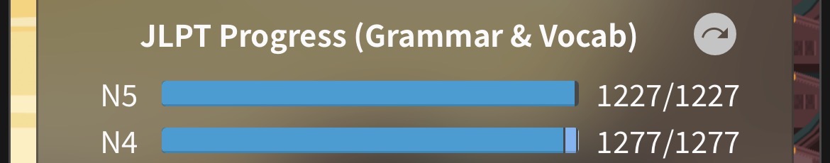 There’s a bit of a buffer on the end of my N5 vocab completion bar, perhaps because there’s a small one for Beginner plus one for Adept plus one for … you get the idea? Or maybe I’m totally wrong about why it’s appearing only for this JLPT level