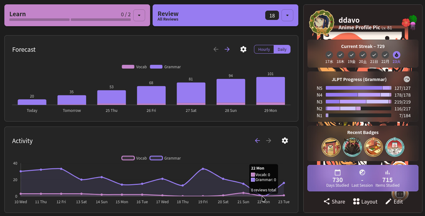 Yesterday I did bunpro in the AVE with a not-so-good internet connection, and today some kind of strange bug happened. It says yesterday I did 0 reviews, while I have the streak checkmark! Also, it says I did 17 reviews today, but I haven’t started. I think it was around 19-21 GMT, certainly before midnight.