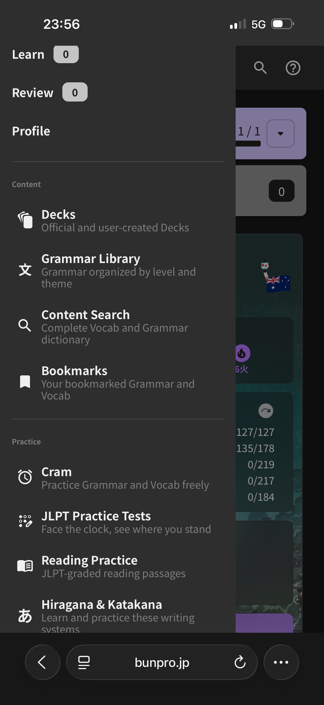 When clicked on, it showed all bunpro grammar arranged under N level tabs, then separated out into ten blocks of grammar for each N-level.