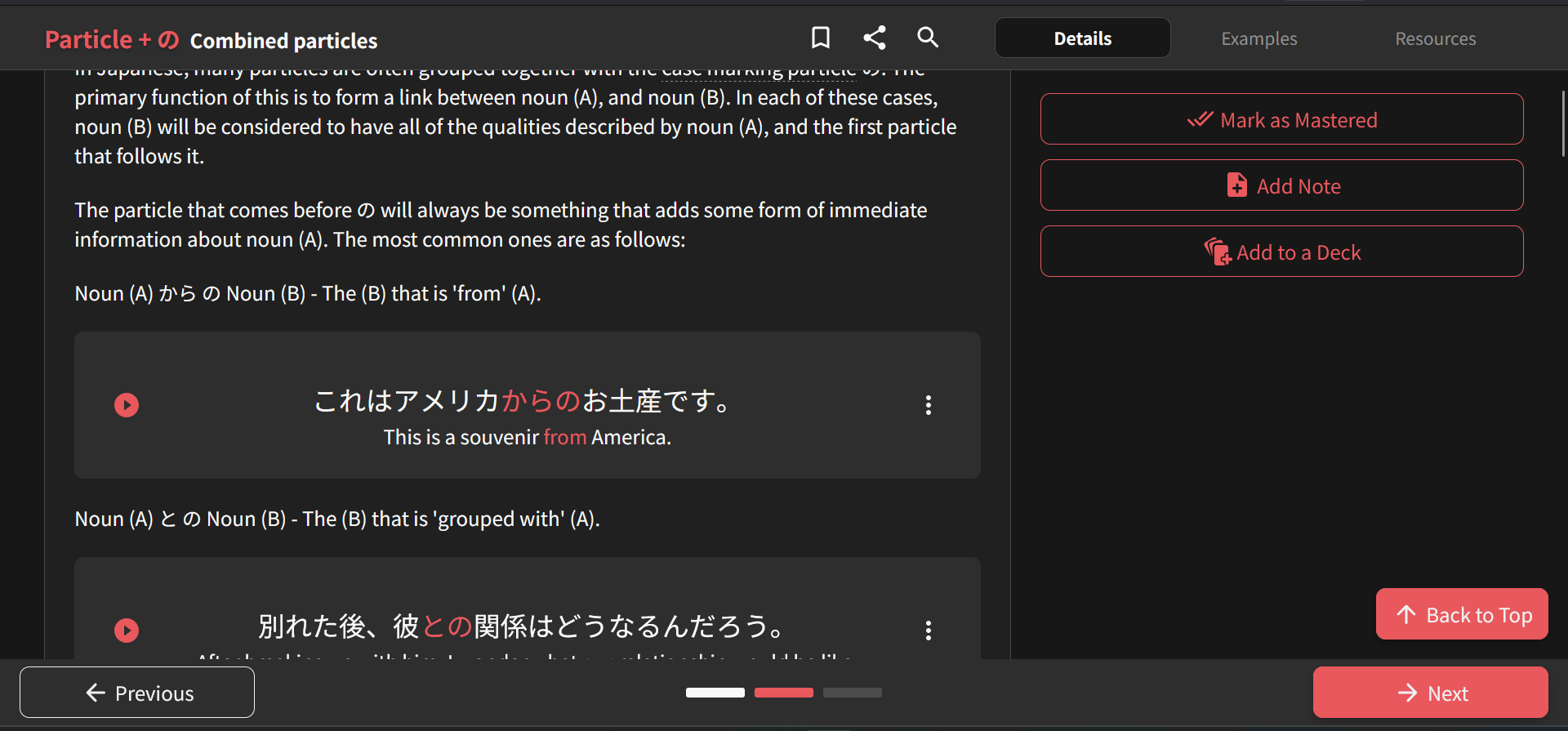 When scrolling down a page while learning a grammar point, there seems to be a space above the ‘Next/Previous’ bar which doesn’t allow for any interaction with the text. In the image below, if I try to hover over the Japanese text at the bottom then the readings do not appear, and I am unable to use Yomitan for finding definitions (I like to try to translate myself before reading the example, but as I said above luckily there’s a setting that fixes my particular issue).