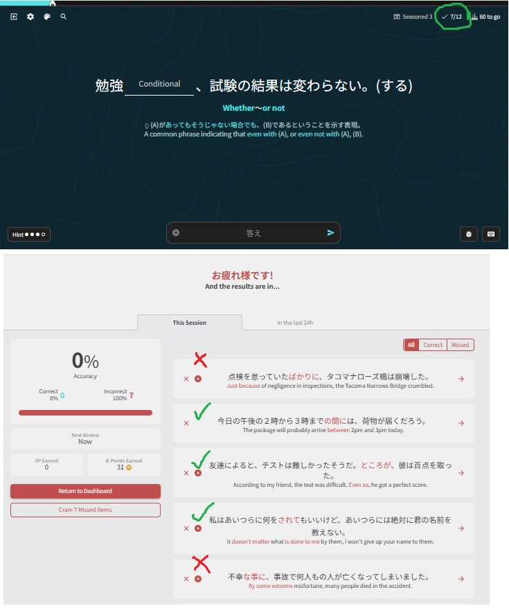 Here is a screenshot of a session. I attempted 12 reviews but I only got 7 correct. The summary claims that I only attempted 7 and that they were all incorrect.