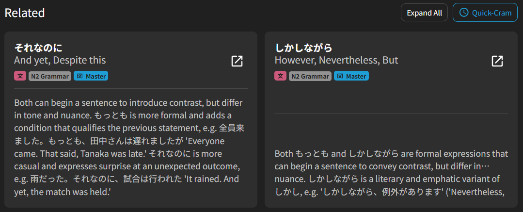 When expanding a “related” grammar point explanation, something a bit weird happens to adjacent cards (see the card on the right below, where the “…” appears before the text continues.
