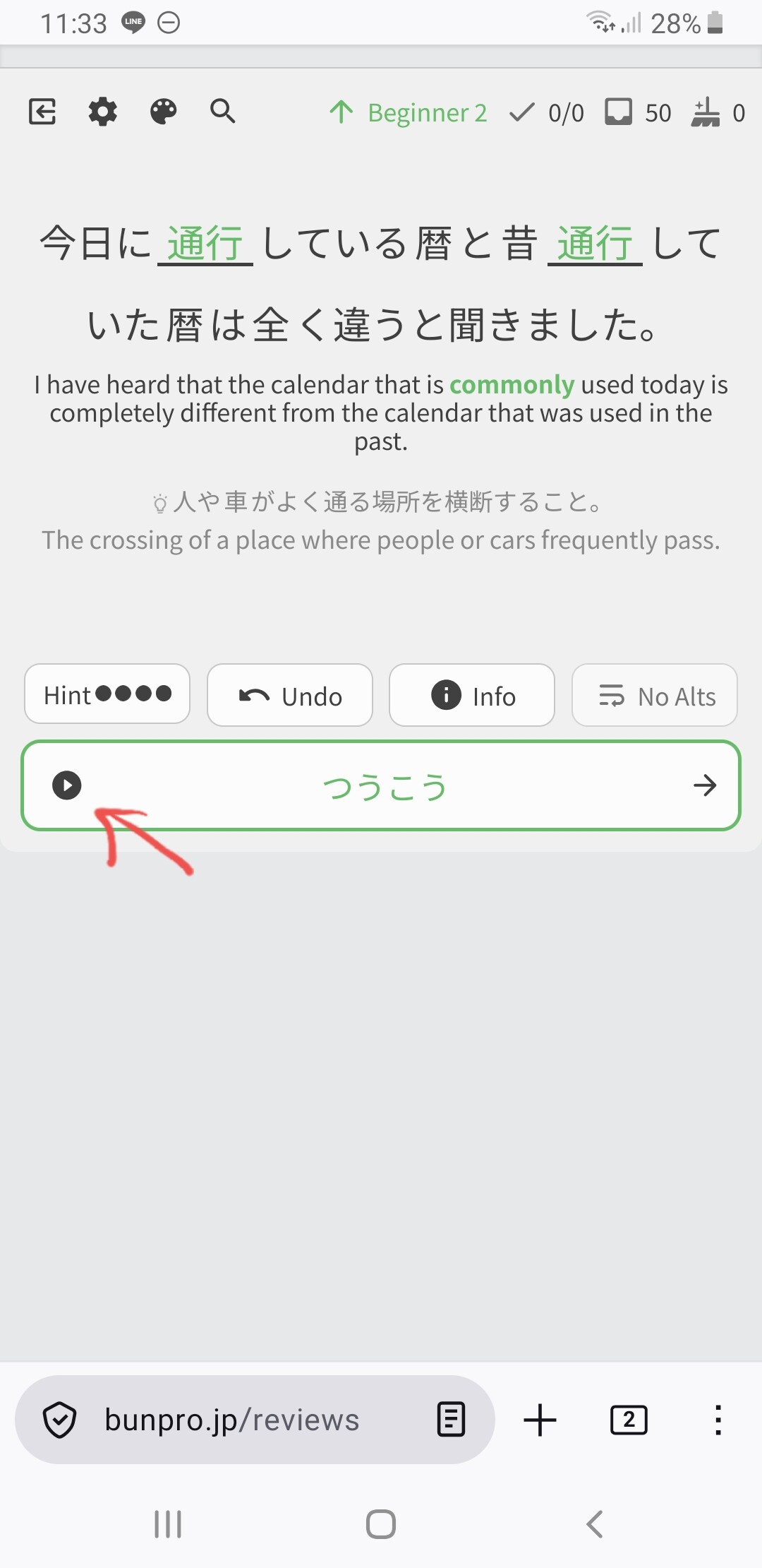 I saw some indication that there should be a play button somewhere on the review screen? I can play audio in the info session page of the grammar point without problems.