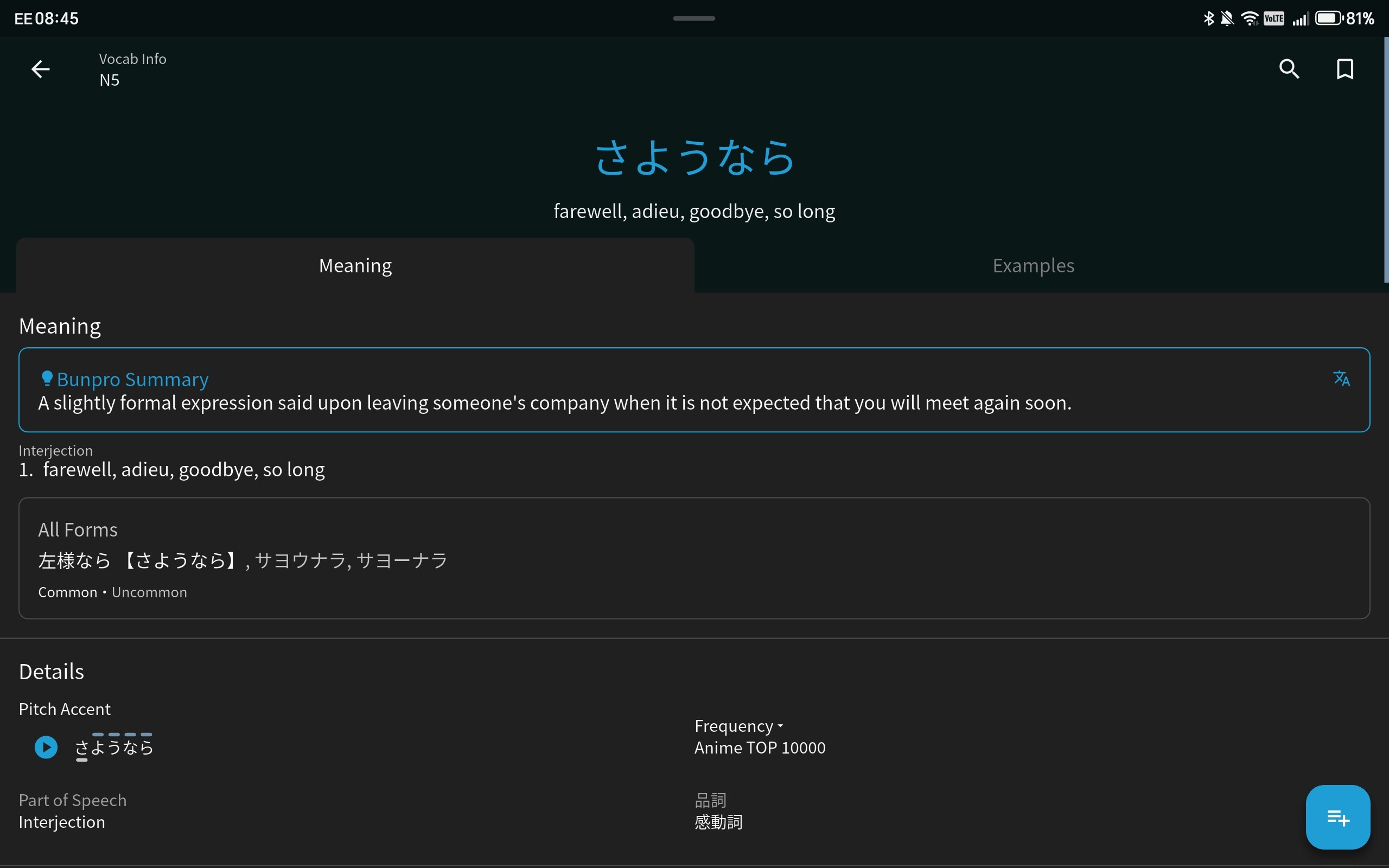 expected behaviour: searching for the katakana form, should yield the result, since it’s listed as one of the forms.