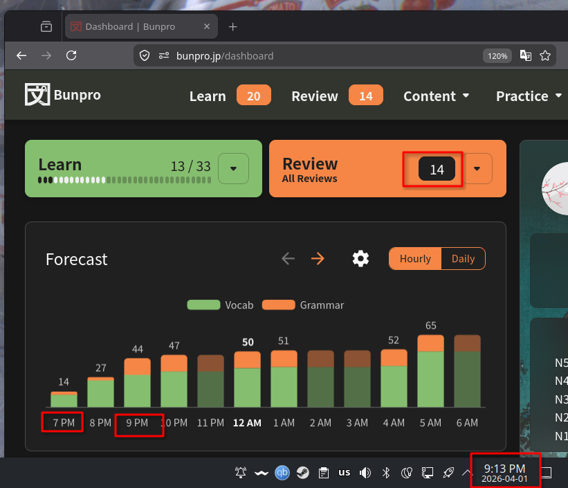As for VPN: I have a browser profile with a split tunnel set up for *.jp to route via Japan proxy, because at some point I got lazy to add every single website that blocks access from outside one by one, I might or might not occasionally have used bunpro with this profile, but that wouldāve been an 8 hour shift and not two.