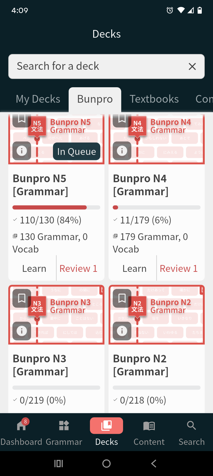 This is on the app. The higher number (which is the correct one I believe) is on the dashboard, in the JLPT progress section. The lower number is in the deck section where you can see all the decks youāre currently studying from. Basically Iām adding new grammar from the N5 deck, and the deck itself isnāt updating the new numbers.