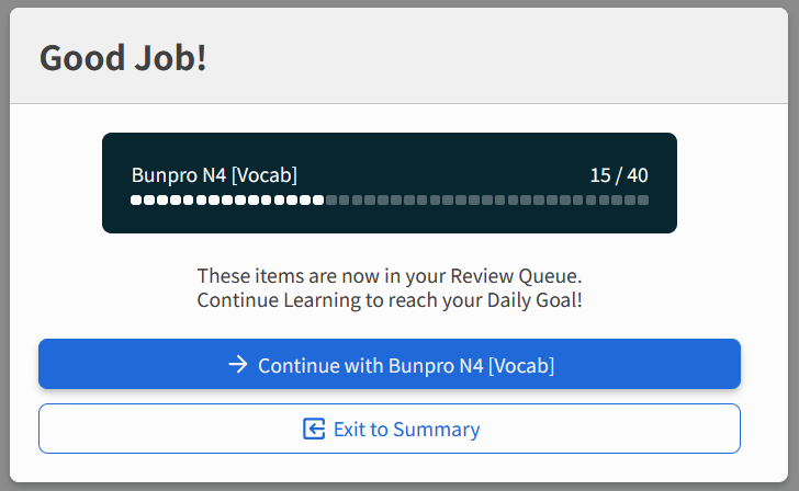 Truth be told, Bunpro started out fantastic and has only improved over the years with added voices, sentences, and features. You guys have done such good work and I totally love everything top to bottom. I would just like to be able to use it more!