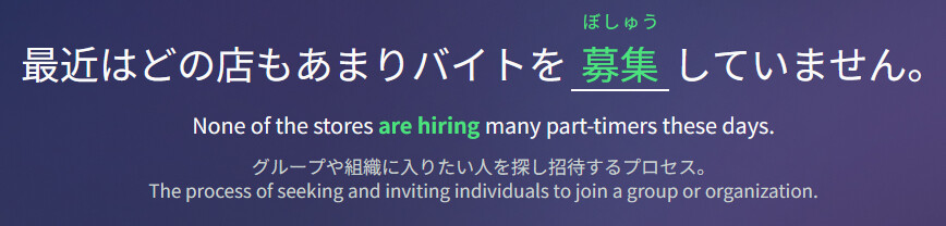 In the vocab 募集 for example, the nuance that gets shown on the vocab page is regarding meaning 1 of the word but makes little sense with the alternative meanings. In sentences where meaning 2 gets used, theres a custom nuance set, so during reviews it shows the nuance of meaning 2. I love this, but id also like to have read that different nuance beforehand, when having learned the vocab.