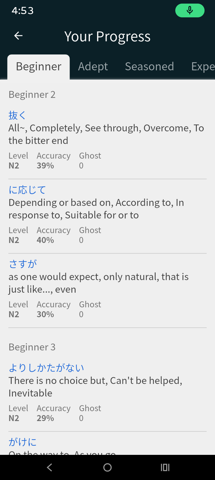First two in Cram option flashcard. The last one from that dashboard in the Progress section when you select any level Beginner, etc