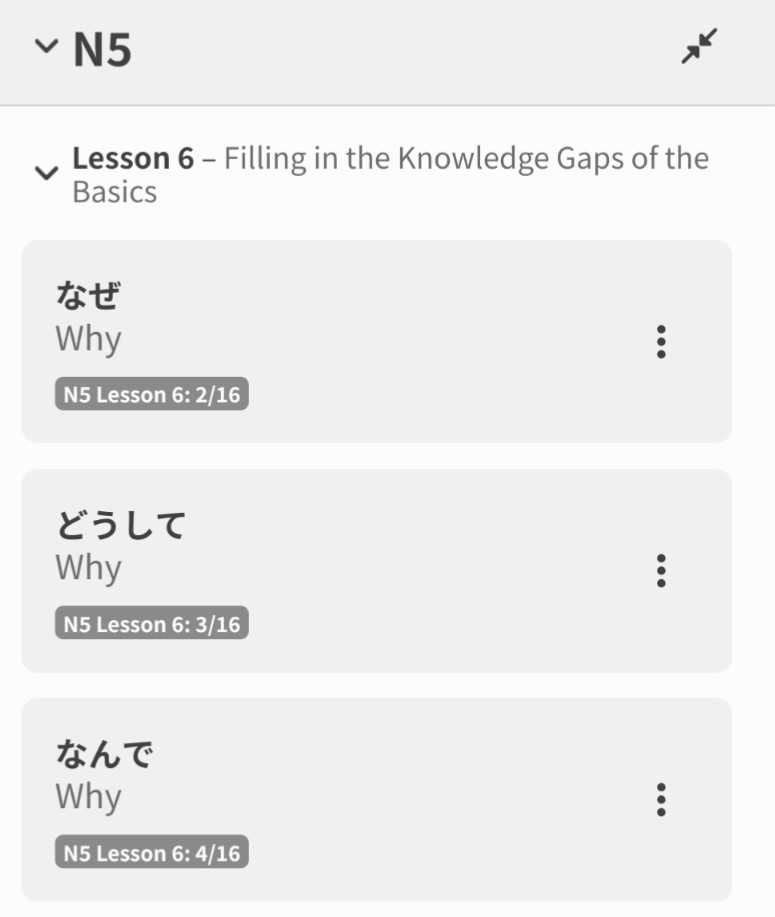 I believe this’ll not only improve learner comprehension, but also give them a feeling of satisfaction as they get further along the N5 grammar deck.