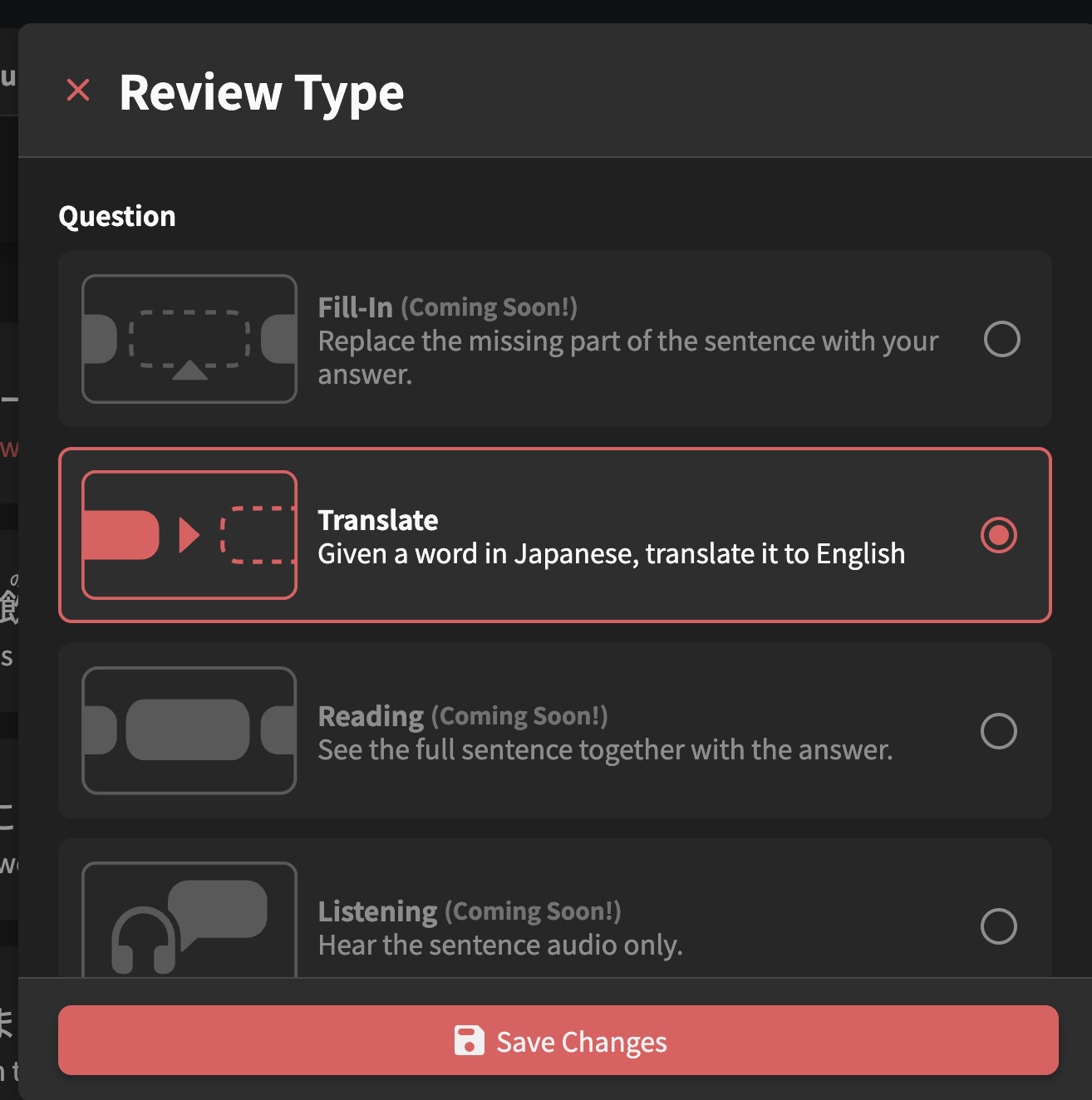 It would also be cool if review mode and SRS level could be connected. So once an item reaches a higher level it can be review as translation/flashcard (for example).