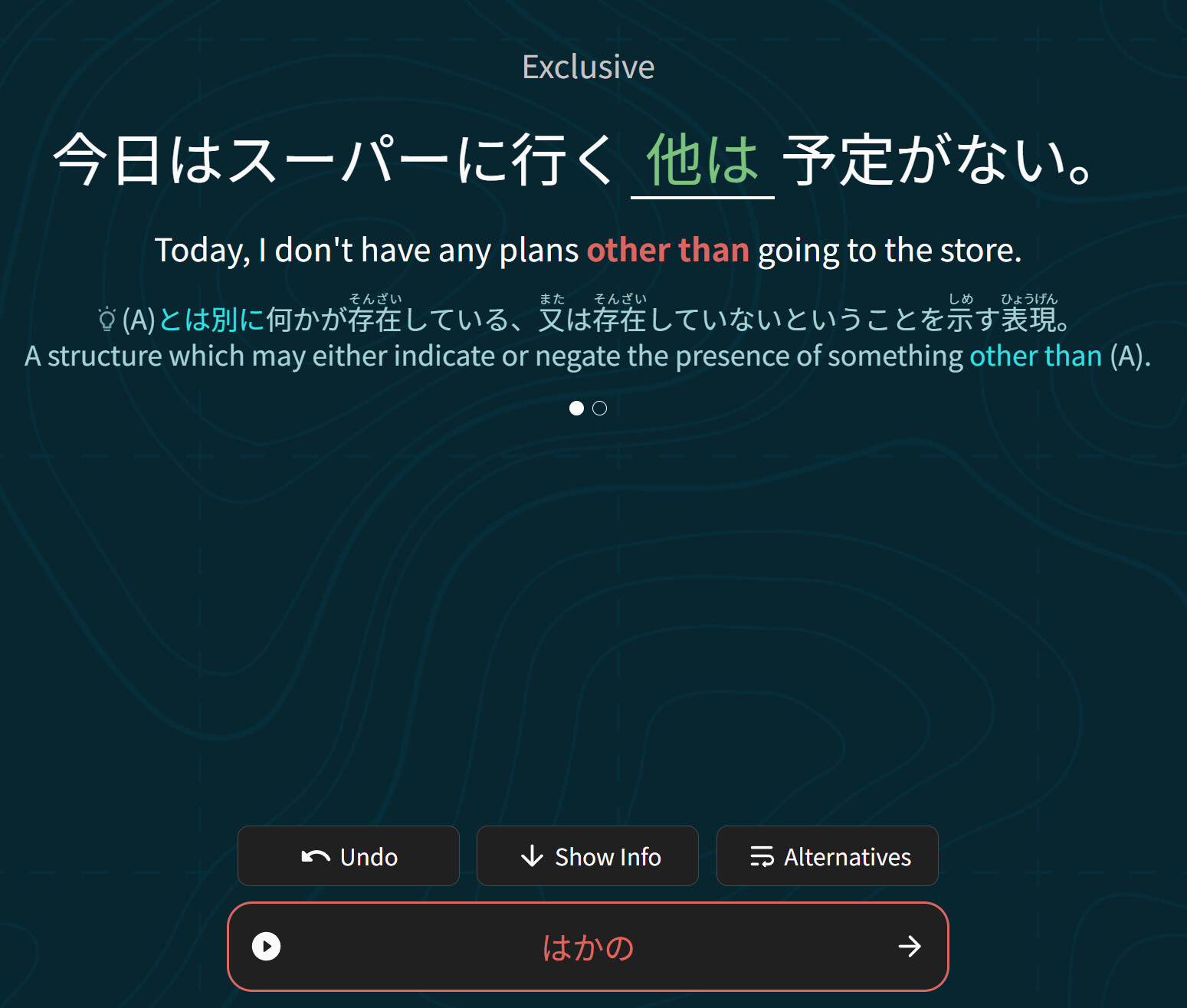 For more example sentences, the first one is also covered by 2 vocabulary items: 他 (JLPT N5) | Bunpro and 他 (JLPT N3) | Bunpro. For the second one there’s actually also a vocab entry 他に (JLPT N5) | Bunpro, so maybe there needs to be some de-duplication or at least cross-linking done here.