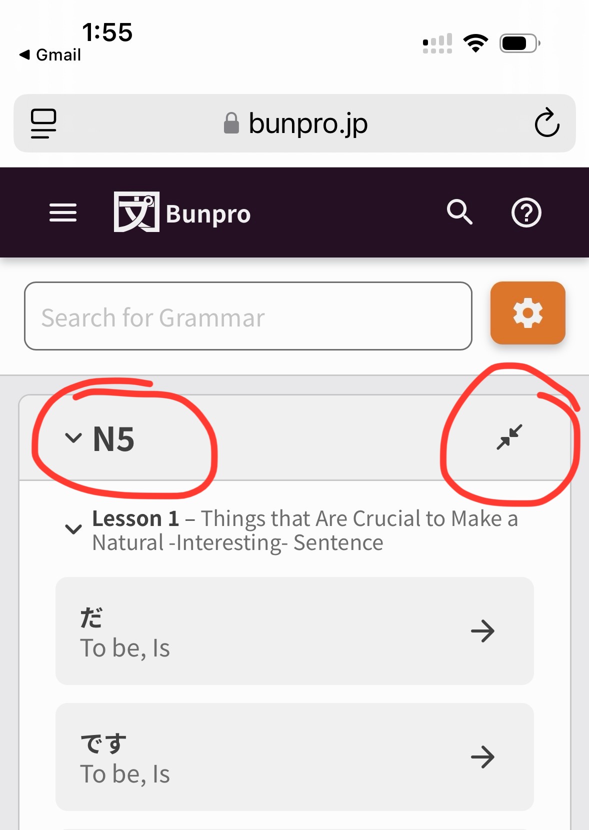 Lessons and whole JLPT Levels can be collapsed to hide information