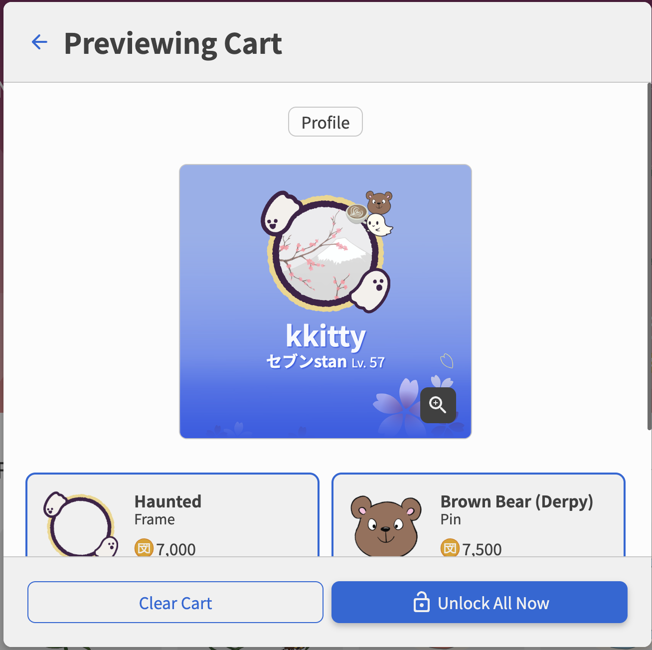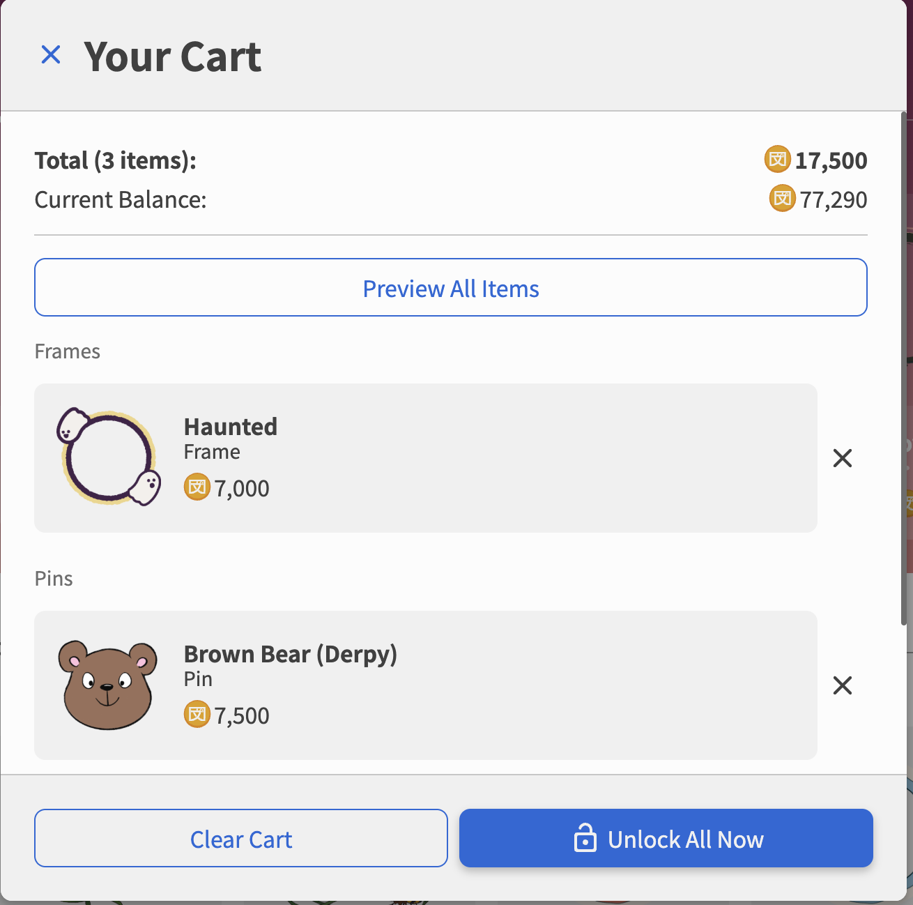 Preview All Items to view how all of the items in your cart would apply to your profile. For example, if you’ve added an avatar frame and 2 pins to your cart, you can see how all of those would spice up your current profile