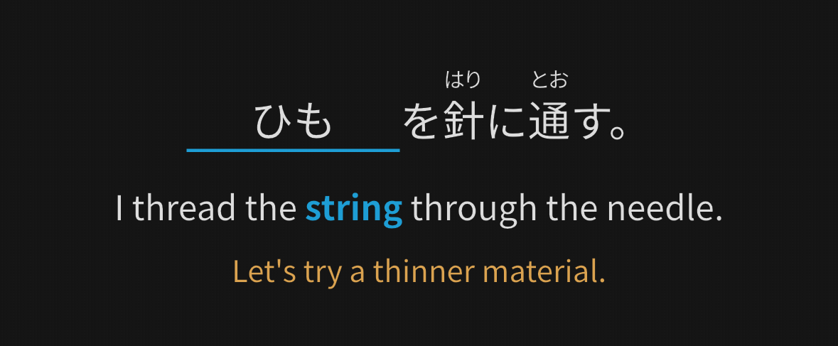 Hmm, this English translation sounds weird to me here… “String” seems inappropriate. “Thread” (as in, “I thread the needle”) or even “yarn” makes sense to my ear, but “string” sounds unnatural to me.