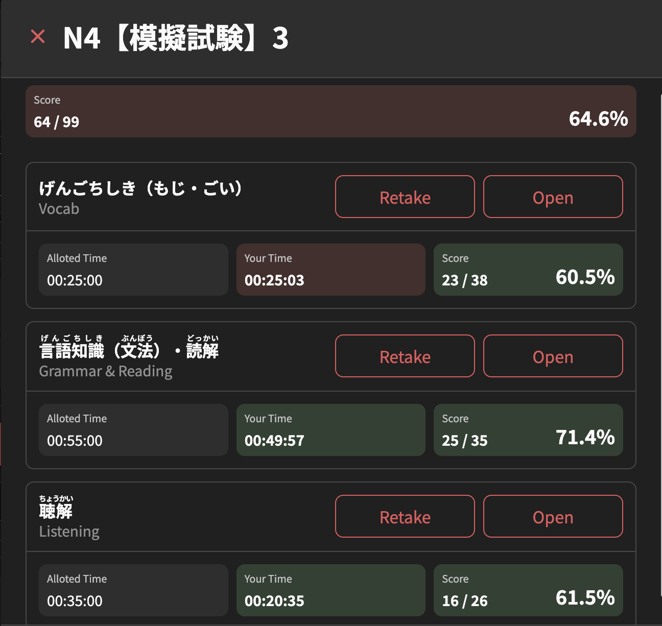 For reference, in the real JLPT N1 in July 2025, I got something like 30/60 for the vocab/grammar and 35/60 for the reading and I remember that I ran out of time pretty dramatically. So my raw score was 54% and I had no time to spare, where as I had 40 minutes left on this practice test. So clearly there is a big difference. I don’t think my skills have improved that much in a few months which suggests to me that while the Bunpro tests are not bad, they are probably on the easy side (to the extent of being a bit redundant if I’m getting all answers correct on the reading.)