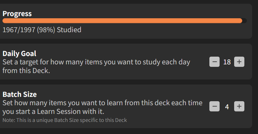 As in, are you asking how I have the fortitude to do 25 words a day (if so, what Cafelatte said is accurate, I’m at around 5200 terms on bunpro and have been actively studying with month ish long breaks for 2 +years, so it’s just I’m currently catching up to where I’m at matching my immersion and stuff, a lot of the words I learn are words I’ve seen at least once, although I’m reaching a point where I may want to slow down as I am starting to run into a bunch of stuff I’ve never seen before).