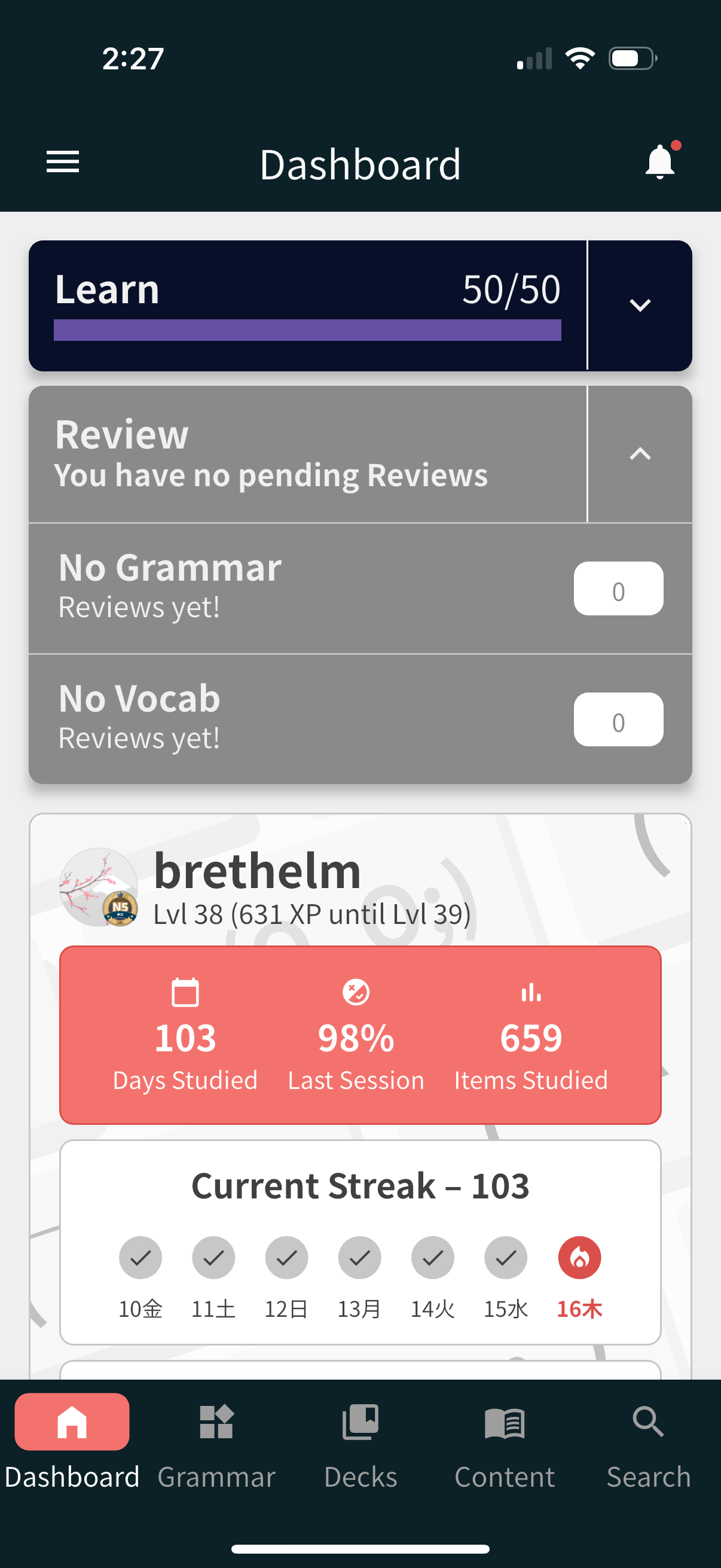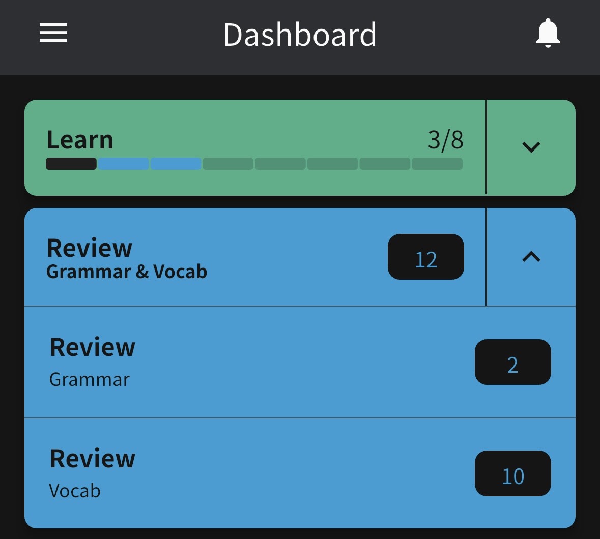 Yes it looks like that. However I’m trying to control the types of reviews that come my way. Mine just says I have such and such reviews to do. In my case, I want to just review grammar for a while. I don’t seem to be able to do that.