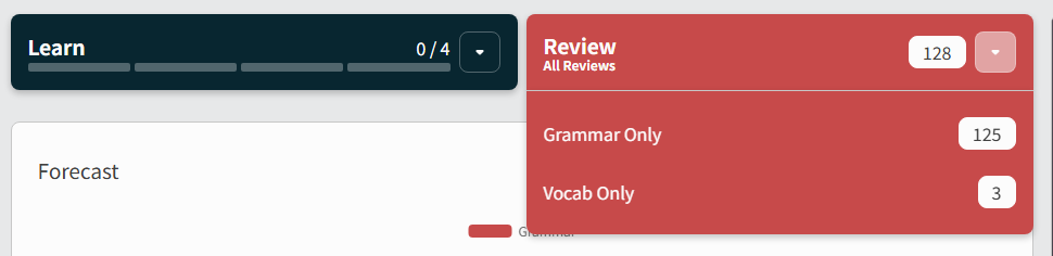 Yes I understand that but what I’m trying to do is stop the flow of vocab reviews and prioritize grammar. That’s what I thought the split reviews functionality would allow me to do. But that functionality is not present for me.