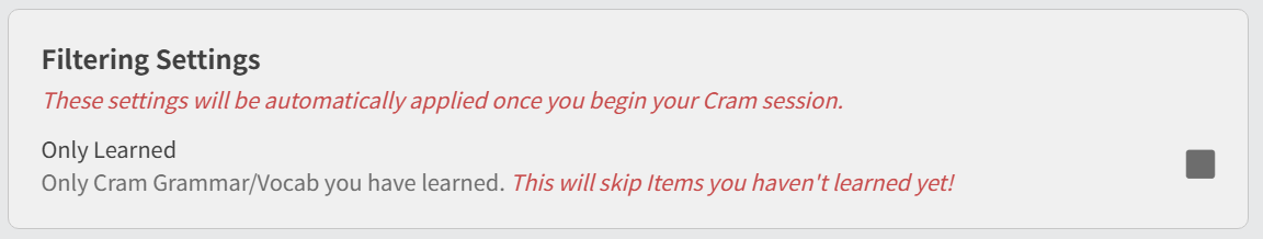 I’ve noticed that Bunpro isn’t giving me as many questions as I request in my cramming sessions. Let’s say I have six vocabulary items I want to cram. If I select those words, and then set the cram session to show me five sentences for each of those words, it should give me 30 questions.