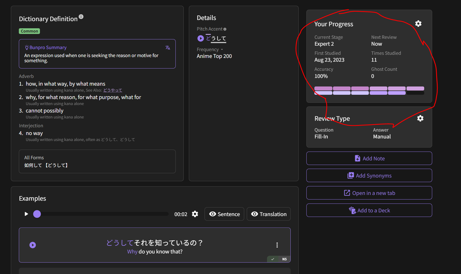 I know Renshuu will let you mark items as known during new lessons and then will automatically give you a new card if you mark it at the beginning of the lesson batch. We already have the Progress bar on individual vocab, I’m just not sure how difficult that would be to integrate into the Lesson function to modify during the Lesson batch screen - or if it already exists and I just don’t know how to do it