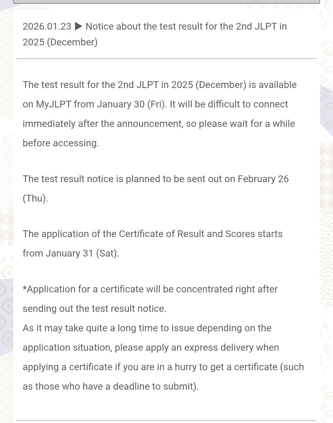 For Japan takers, there is finally an announcement that result will be available online starting January 30.