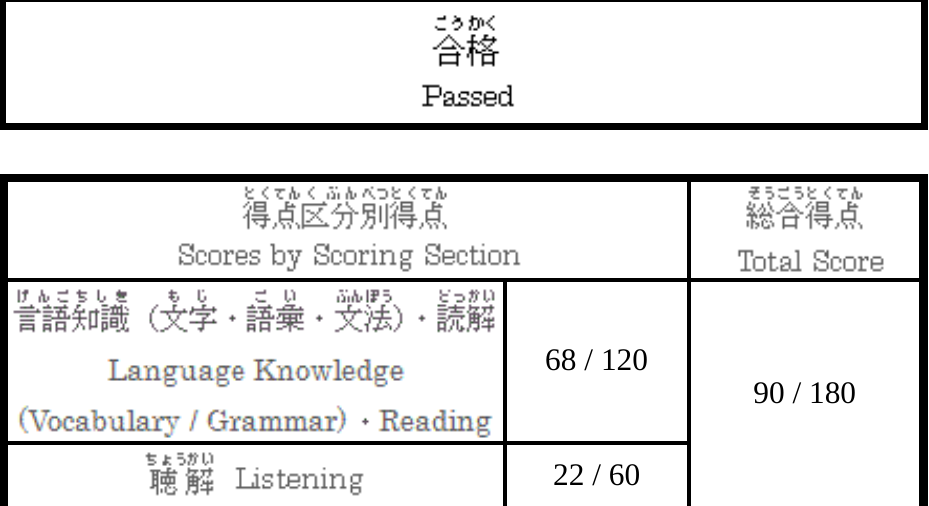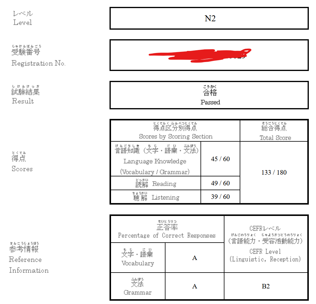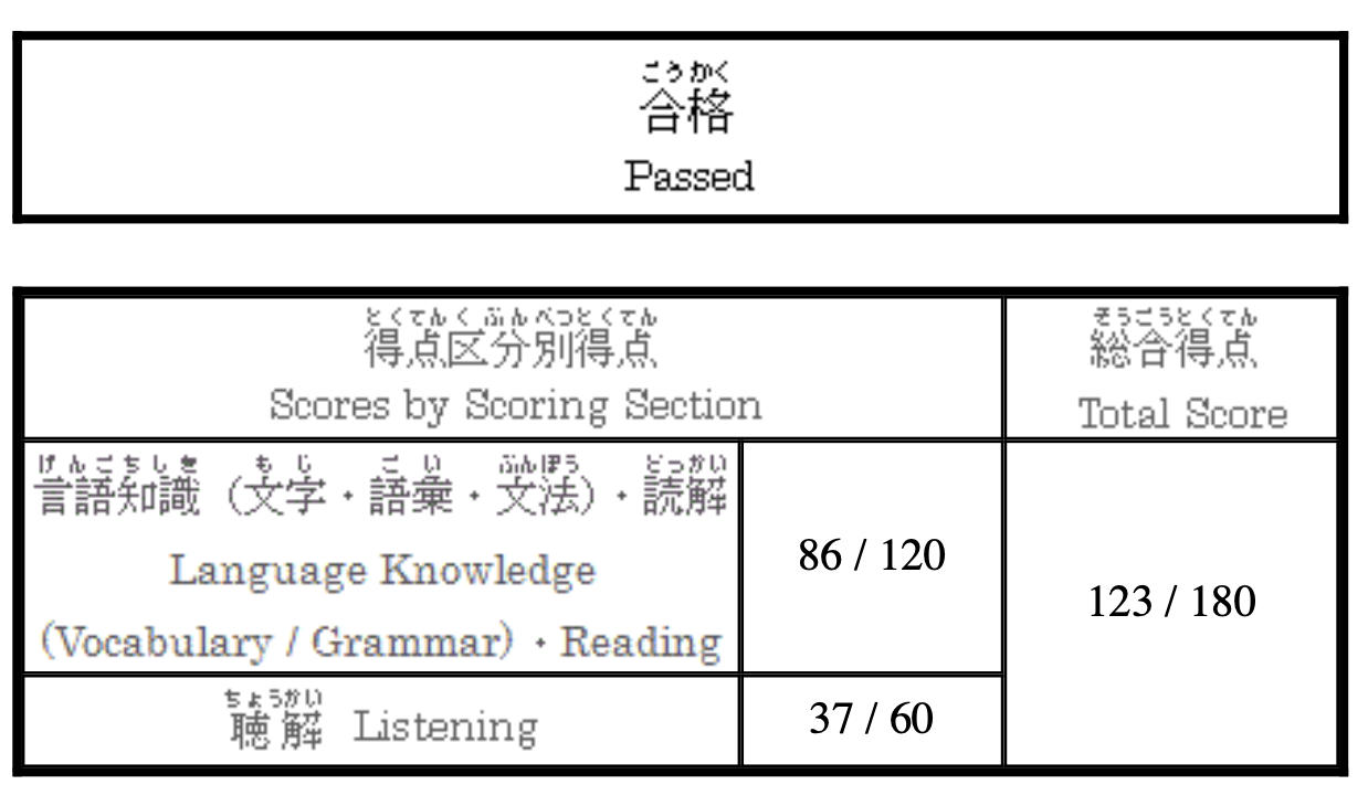 I somehow passed the N2 with 123/180. My weakest was reading with 29/60, the rest were around 45-ish if I remember correctly. I’m pretty happy but I wish I had at least half marks in the reading. But hey a pass is a pass!
