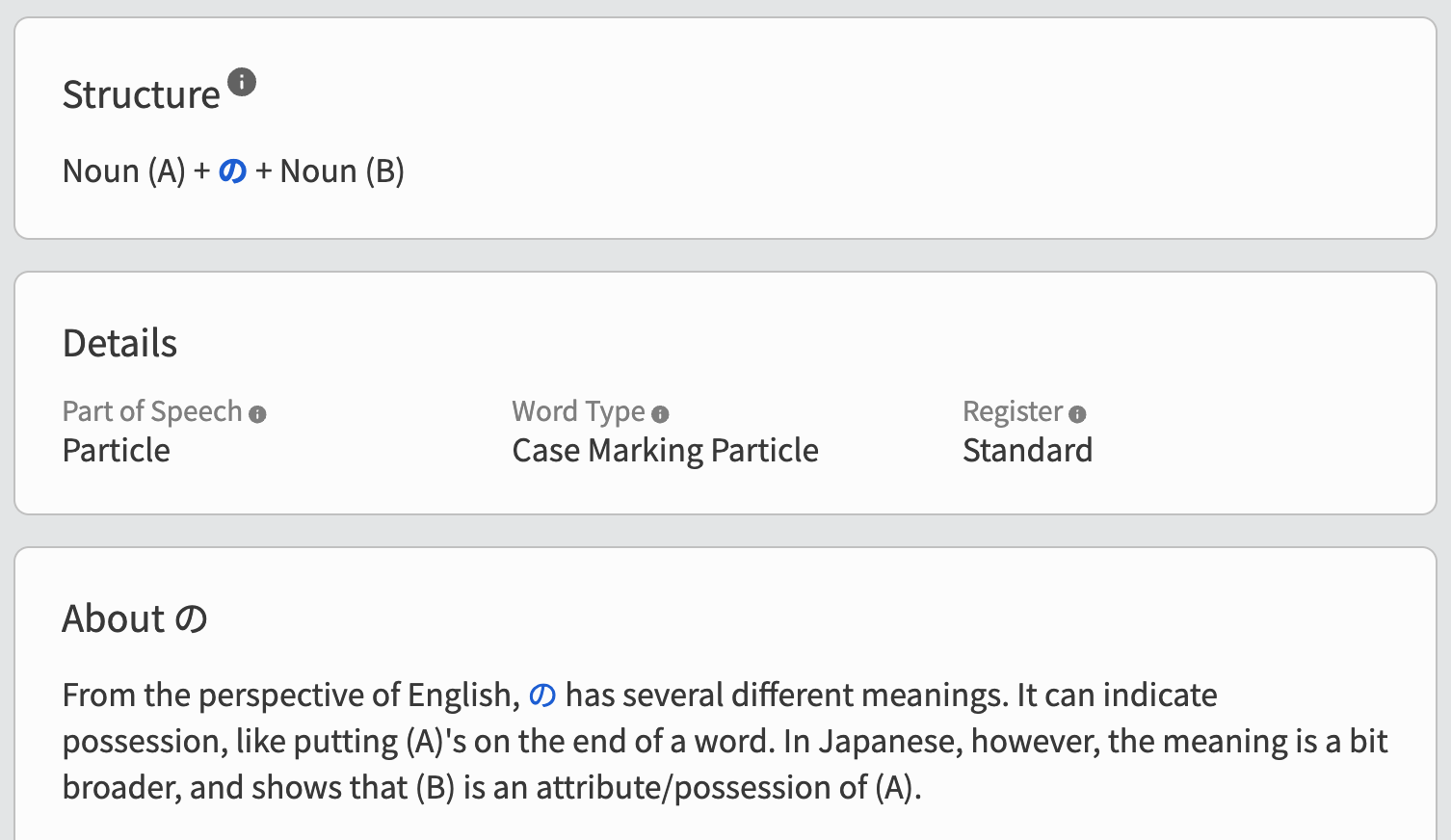 In general, I like the way the lessons often use (A) and (B) as placeholders for a grammatical construct. But the syntax isn’t always explained up front. For example, a “good” lesson is pictured below. Notice that the Structure section clearly identifies where (A) and (B) belong. And then in About section, any references to (A) and (B) are unambiguous.