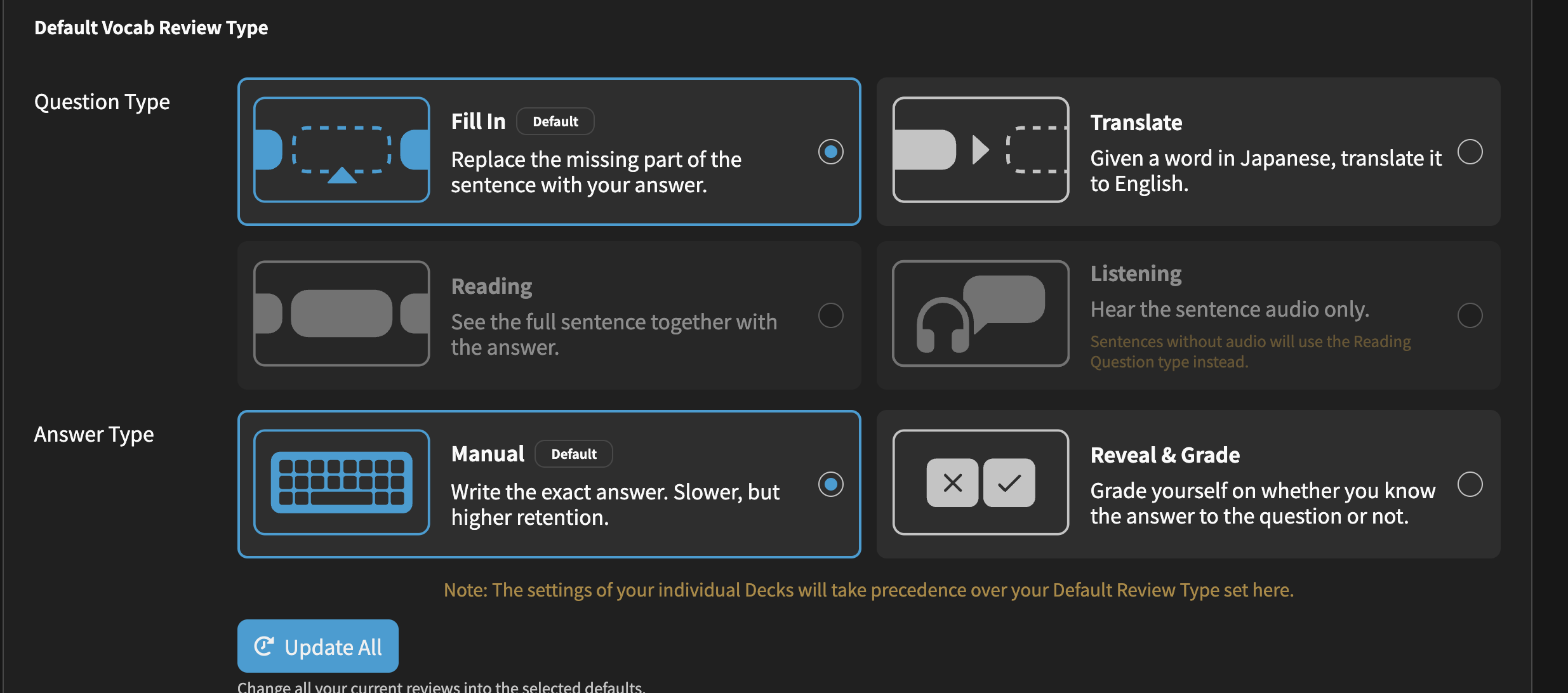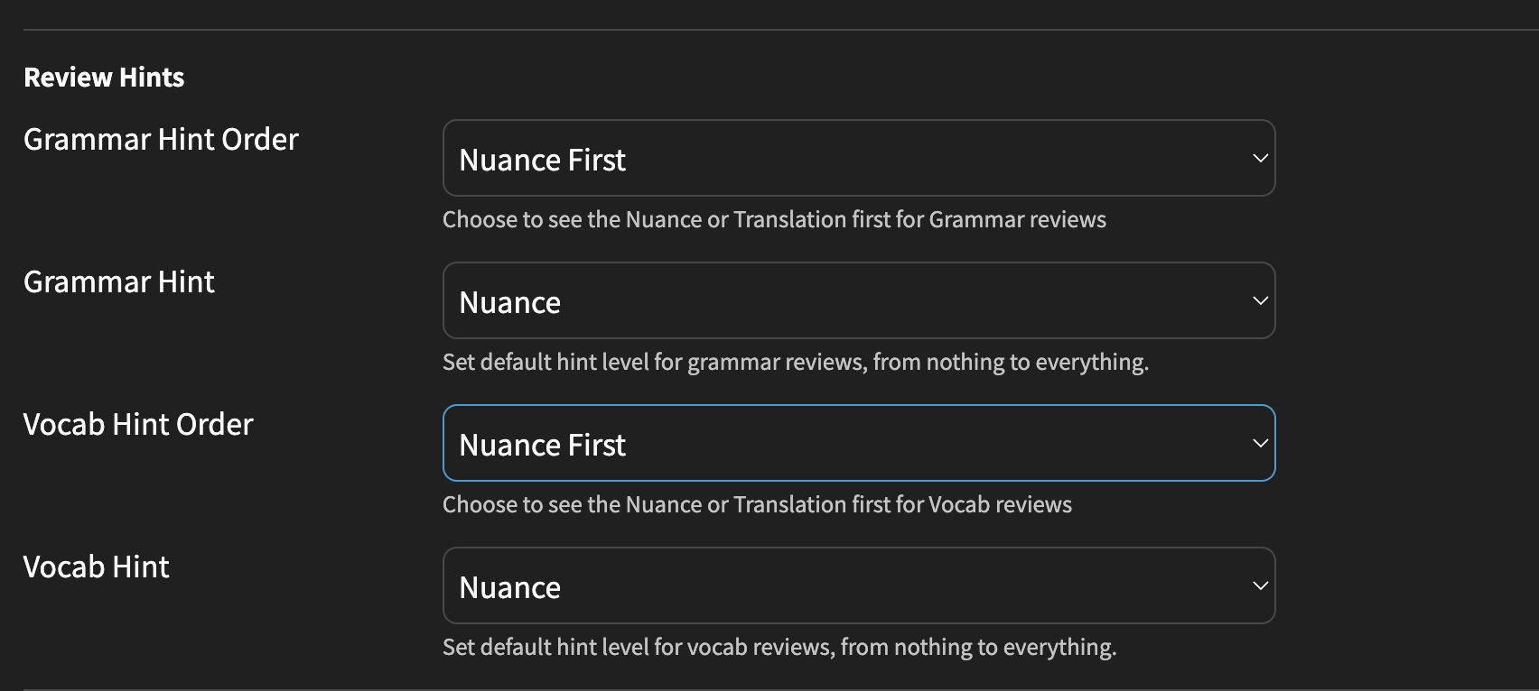 and for reviews, I use Fill-In question type, with Manual answer type, Nuance as Vocab Hint type, Nuance First as Vocab Hint Order (all these are in the settings)