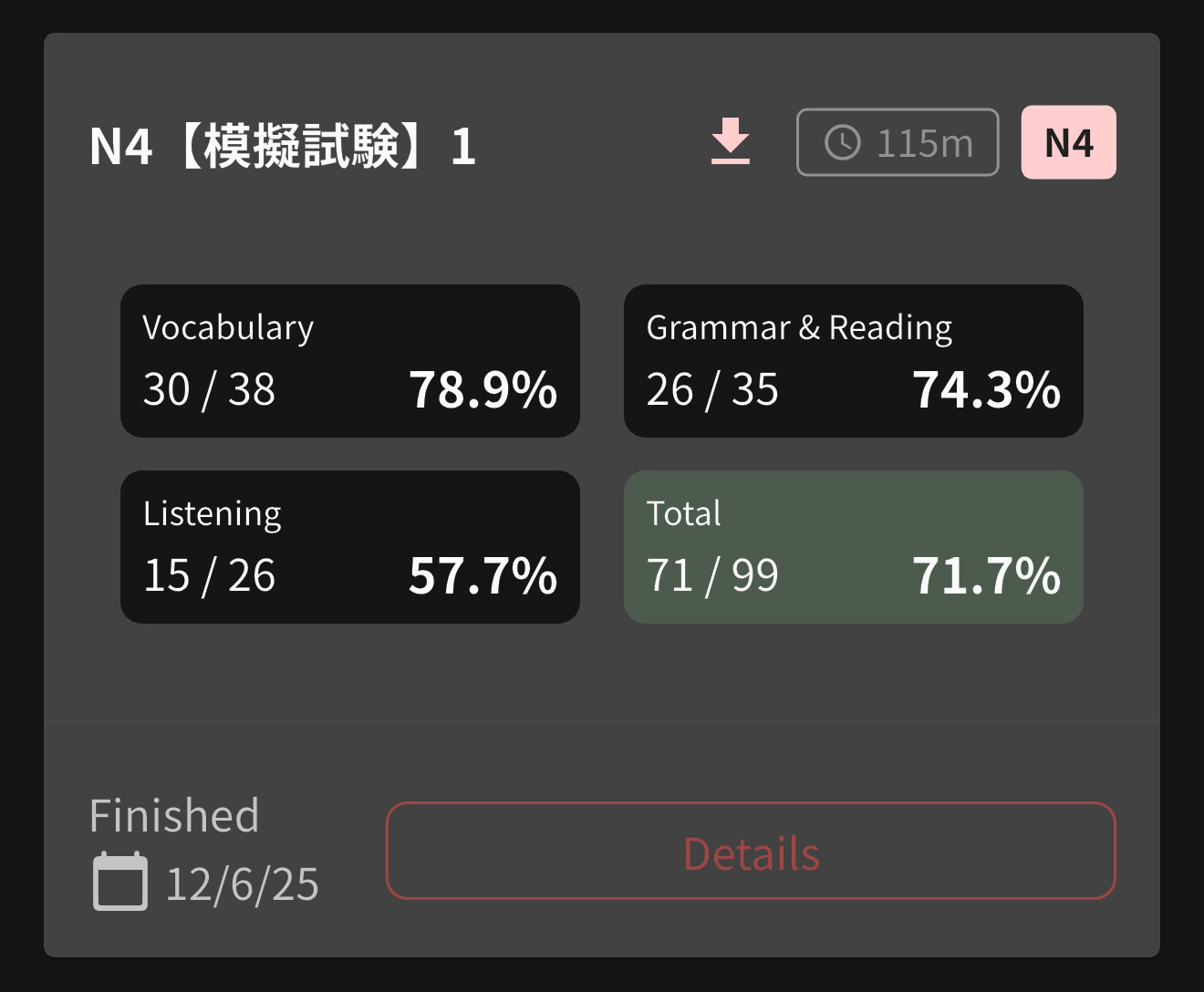 I had a really nice improvement on my N4 Practice test. I got an overall score of 64.6% on the first try, a 61.6% on the second try, and then I got this score on my third try. My listening score actually improved from the second time (53.8%), but was not as good as my first listening score (61.5%). I didn’t get to take this test in one sitting. I took these sections during various down time periods at work.