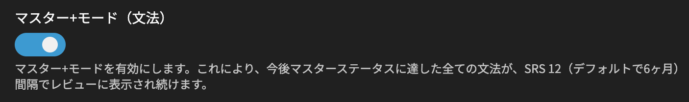 It would be nice to be able to set Master/Master+ manually in the “Your Progress” section for fine tuning, like “Set as SRS Level” for Master would allow to choose between the two. The problem with “update all” is that Master+ for the really basic N5 grammar points is not very useful, repeating them every 6 months is just wasted time.