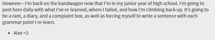 However—I’m back on the bandwagon now that I’m in my junior year of high school. I’m going to post here daily with what I’ve re-learned, where I failed, and how I’m climbing back up. It’s going to be a rant, a diary, and a complaint box, as well as forcing myself to write a sentence with each grammar point I re-learn.